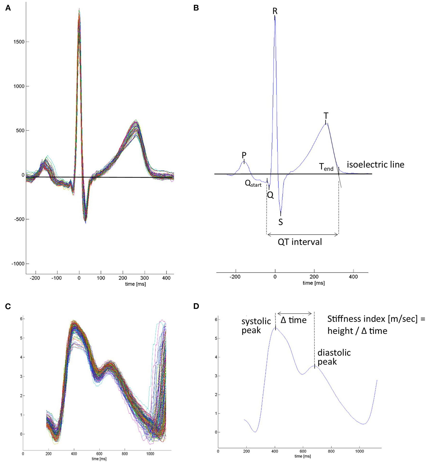 Mean waveforms from ECG-triggered ensemble averaged ECG and plethysmographic pulse wave. (A) Superimposed beat-by-beat ECG over a 1-min period. (B) Averaged mean ECG waveform over a 1-min interval. ECG markers were placed, and ECG-derived parameters were calculated. P, p-wave; Qstart, the beginning of the Q wave and start of the QT interval; Q-R-S, QRS complex; T, t-wave peak; Tend, end of t-wave and end of the QT interval, set at the connection point between the tangent of the steepest downslope of the T wave and the isoelectric line. (C) Superimposed beat-by-beat pulse waves. (D) Average pulse wave contour over a 1-min interval. Pulse wave-derived parameters were calculated. In case the diastolic maximum presented no peak, it was placed at the inflection point after the systolic peak.