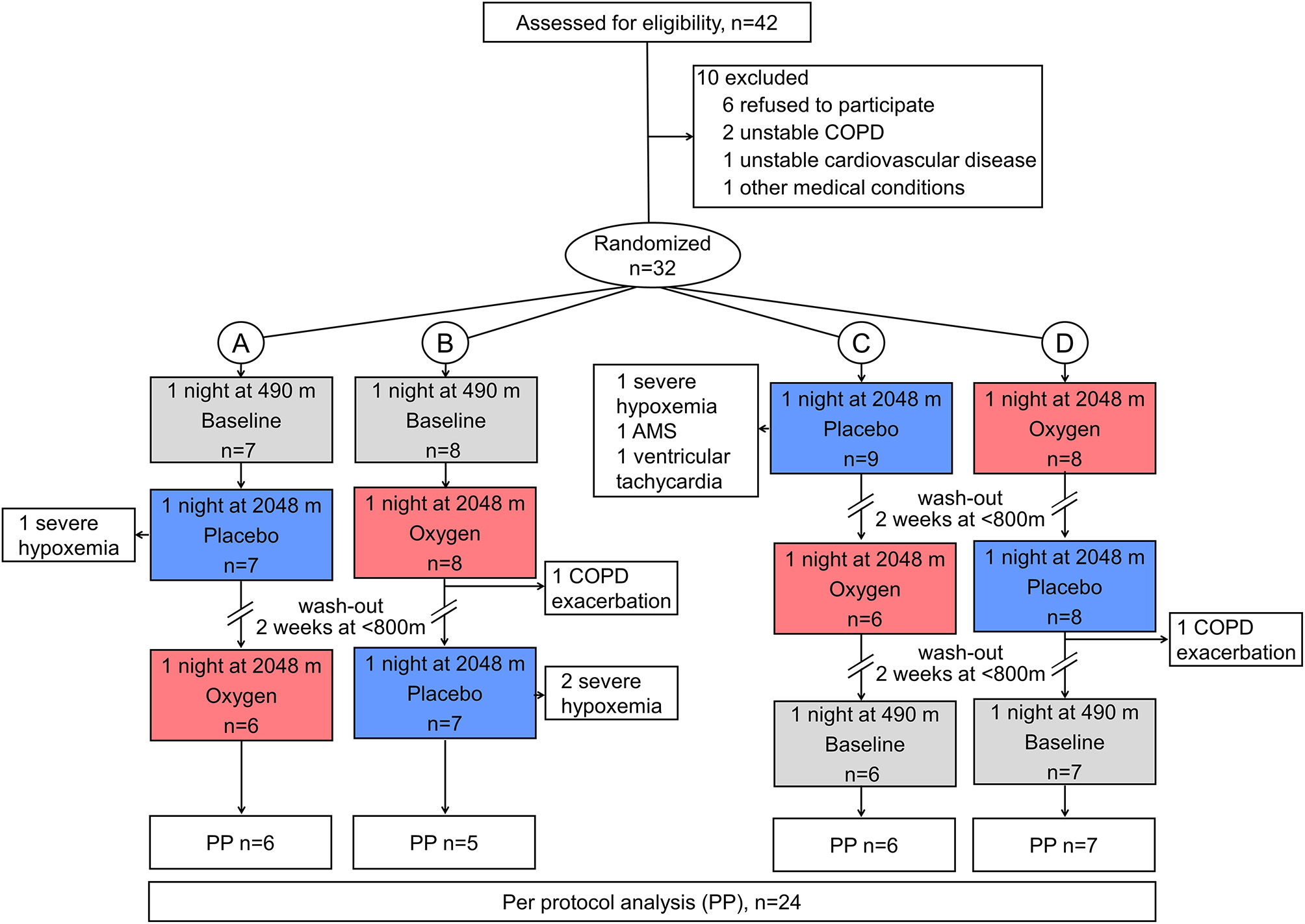 Figure 2. CONSORT flowchart. Altitude allocation sequence (A–D) and order of intervention (oxygen, red color; or placebo, blue color) at 2,048 m were randomized. After evaluations at 2,048 m, a 2-week washout period at <800 m was applied to avoid carryover effects. COPD, chronic obstructive pulmonary disease; PP, per protocol.