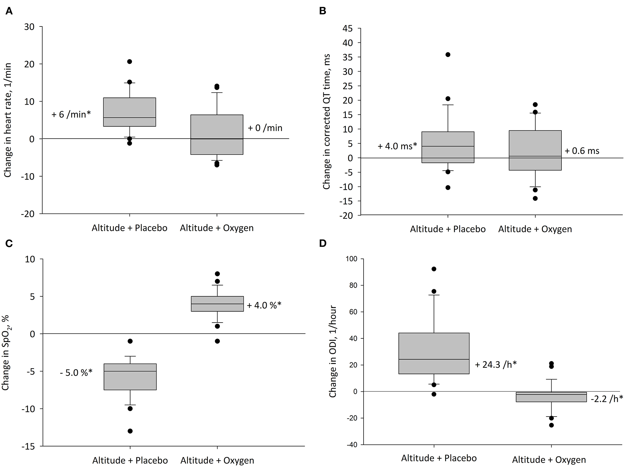 Altitude-induced changes in main outcomes. The box plots represent the changes between values at 490 and 2,048 m with corresponding treatment. Boxes and whiskers represent medians, quartiles, and 10th and 90th percentiles; dots represent individual values outside this range for (A) heart rate, (B) heart rate corrected QT interval (QTc), (C) oxygen saturation (SpO2), and (D) oxygen desaturation index (ODI). *P < 0.05 vs. 490 m.