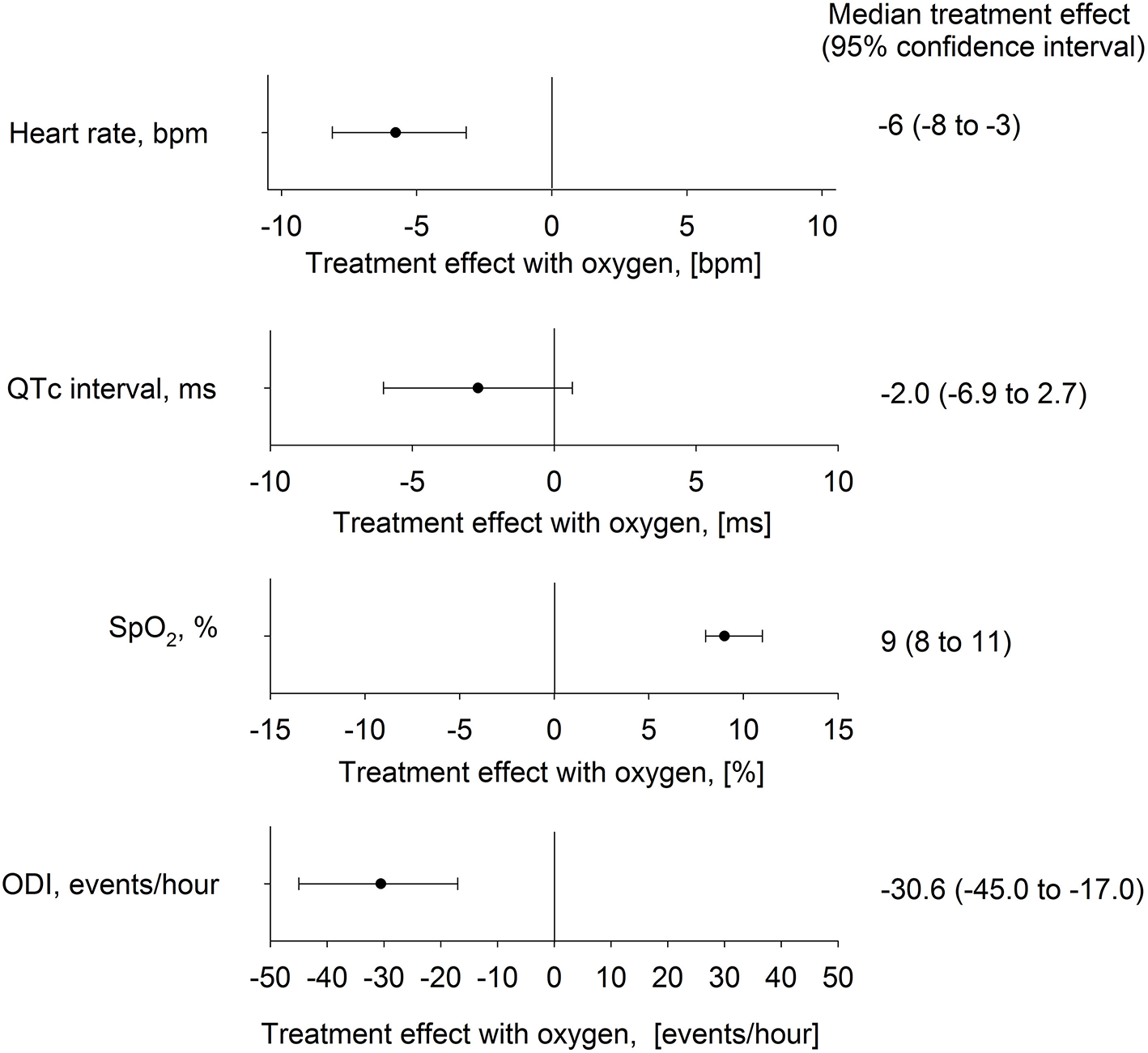 Figure 4. Effect of nocturnal oxygen therapy at 2,048 m on main outcomes. The plot shows median difference (95% confidence intervals) between altitude-induced changes during nights with oxygen and placebo for the heart rate, corrected QT interval (QTc), oxygen saturation (SpO2), and oxygen desaturation index (ODI).