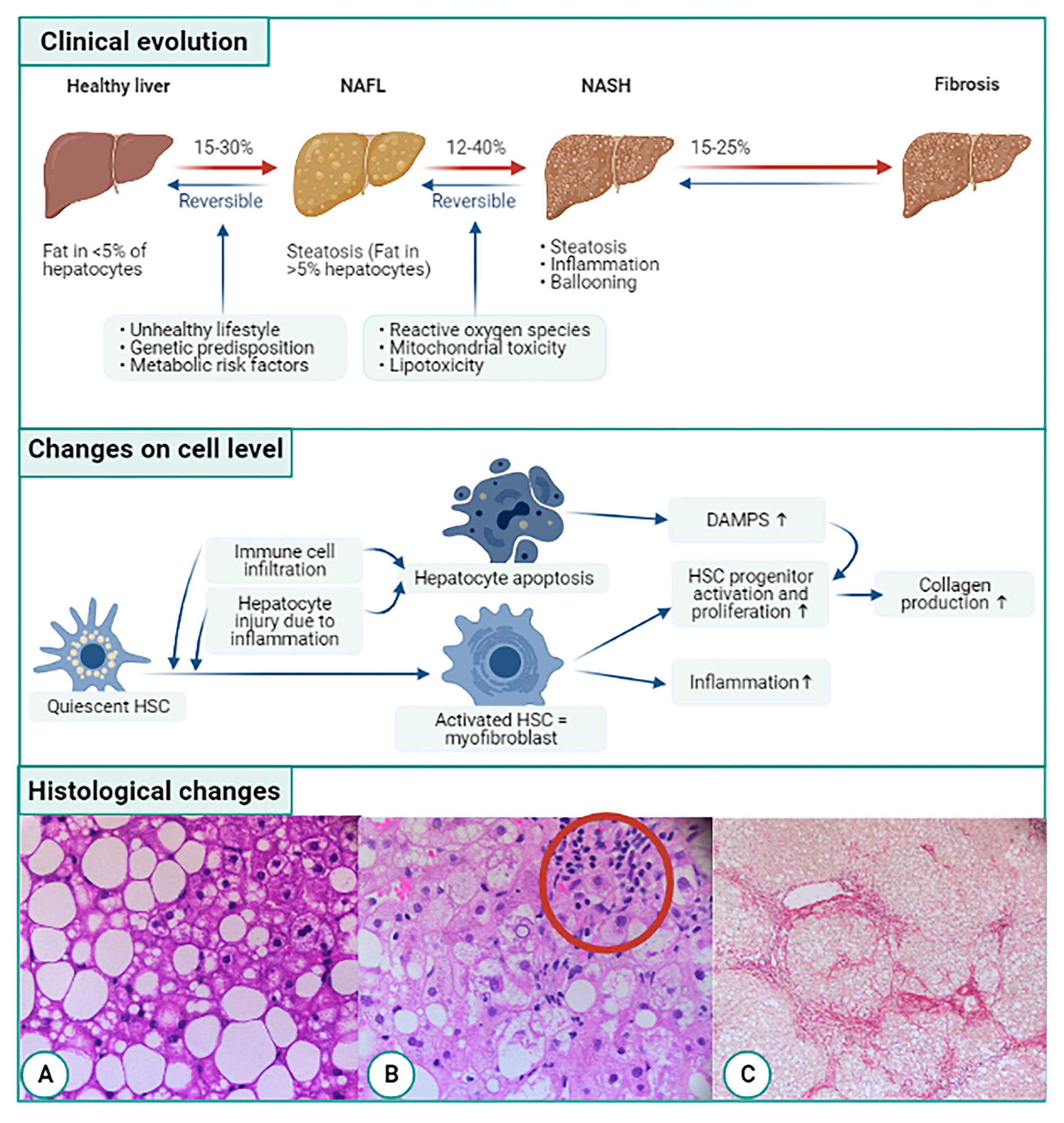 Overview of evolution of NAFLD related fibrogenesis on clinical, cellular, and histological level. On the clinical level NAFLD starts of as simple steatosis (NAFL). The abnormal amount of liver fat triggers inflammation by infiltrating immune cells and secretion of cytokines. This is called non-alcoholic steatohepatitis or NASH which can cause liver fibrosis. On cellular level, quiescent hepatic stellate cells (HSCs) are activated by immune cell infiltration and hepatocyte injury due to inflammation. The activated HSC transdifferentiates into collagen producing myofibroblasts furthermore the myofibroblasts trigger HSC progenitor proliferation and activation. Another consequence of the immune cell infiltration and hepatocyte injury is apoptosis of hepatocytes, leading to the release of damage-associated patterns (DAMPs). DAMPs also activate hepatic progenitor cells. Both the myofibroblasts and HSCs will start producing collagen. On a histological level, first fat accumulates in the liver (A). This leads to the infiltration of immune cells (B) and ballooning and eventually liver fibrosis occurs (C). Histological pictures courtesy of Dr. P. Van Eyken, pathologist, Ziekenhuis Oost-Limburg, Genk, Belgium.