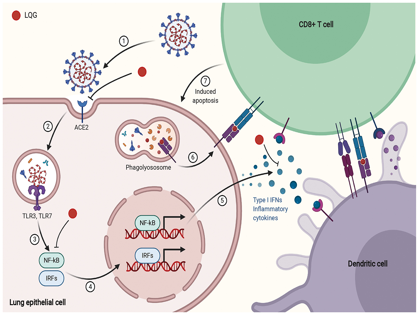 | LQG | Forsythia suspensa (Thunb.) Vahl (Forsythoside A) | Controlled influenza A virus (IAV) infection and improved the prognosis of IAV infection | TLR7, MyD88, TRAF6, IRAK4 and NF-κB p65 mRNA | Inhibited influenza A virus replication. | (56) |