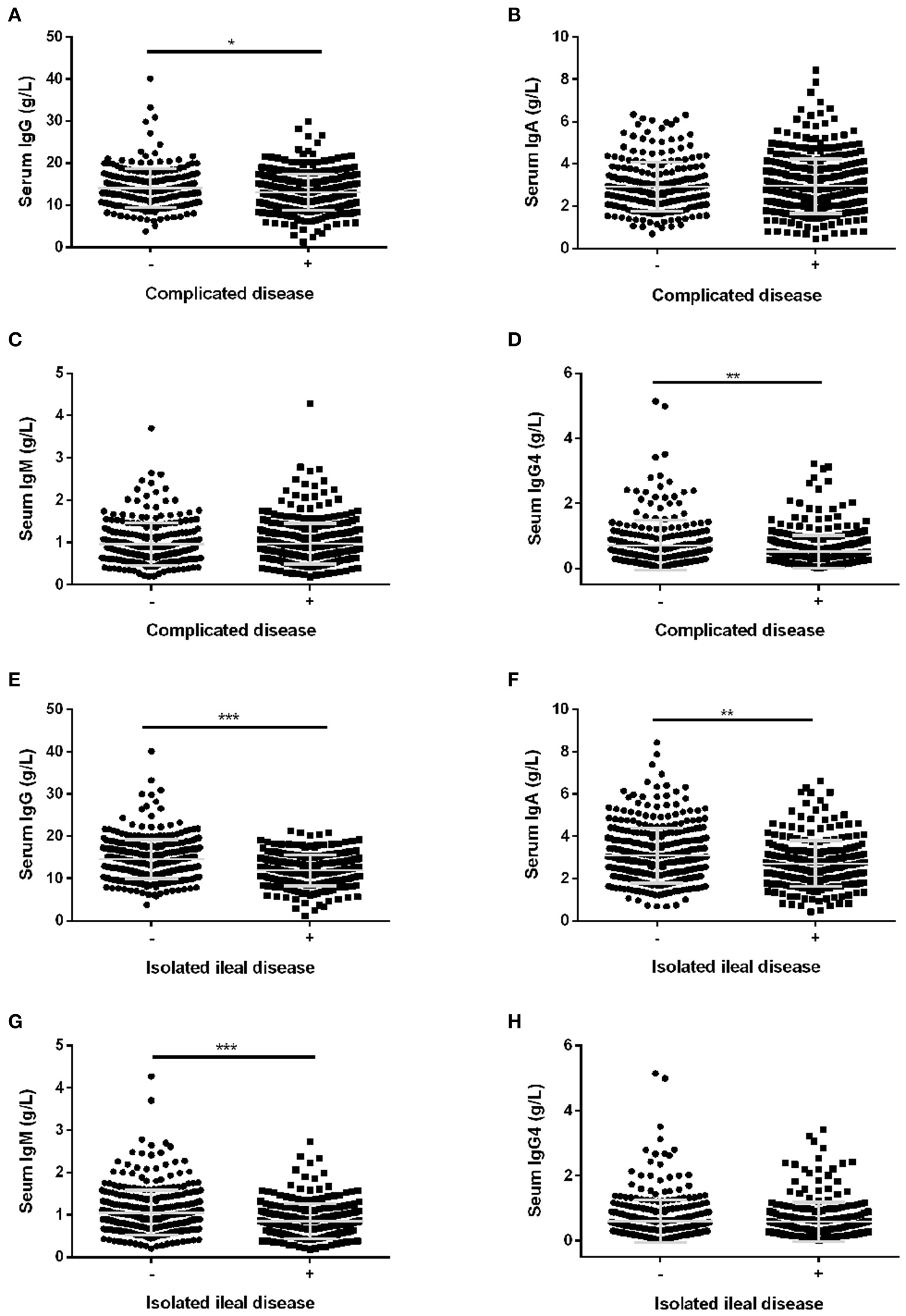 The levels of serum immunoglobulins in CD patients with different disease phenotypes. The levels of serum IgG (A), serum IgA (B), serum IgM (C), and serum IgG4 (D) in CD patients with complicated disease. The levels of serum IgG (E), IgA (F), IgM (G) and IgG4 (H) in CD patients with isolated ileal disease. Bar graphs are presented as mean ± SD. *P < 0.05, **P < 0.01, ***P < 0.001.