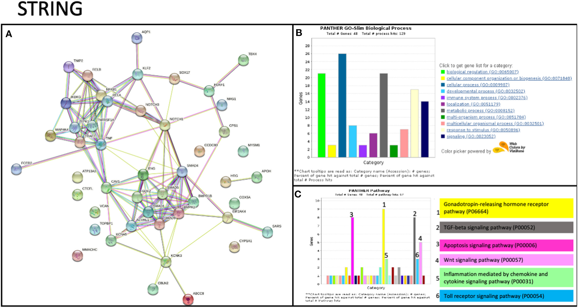 STRING analysis of TRAF2 and TNIP2 related to previously associated genes to PAH. (A) Protein network showing the possible interactions between all genes associated with PAH. This graph includes genes previously associated with PAH and candidate genes described in case reports/series. The strength of evidence for the relation between TRAF2 and CAV1 comes from published experimental/biochemical data and association in curated databases (see Methods). (B,C) Gene enrichment analysis, including biological processes (B) and interaction pathways (C) in which the STRING analysis genes are involved. Several genes are involved in the immune system process and participate in inflammation mediated by chemokine and cytokine signaling.