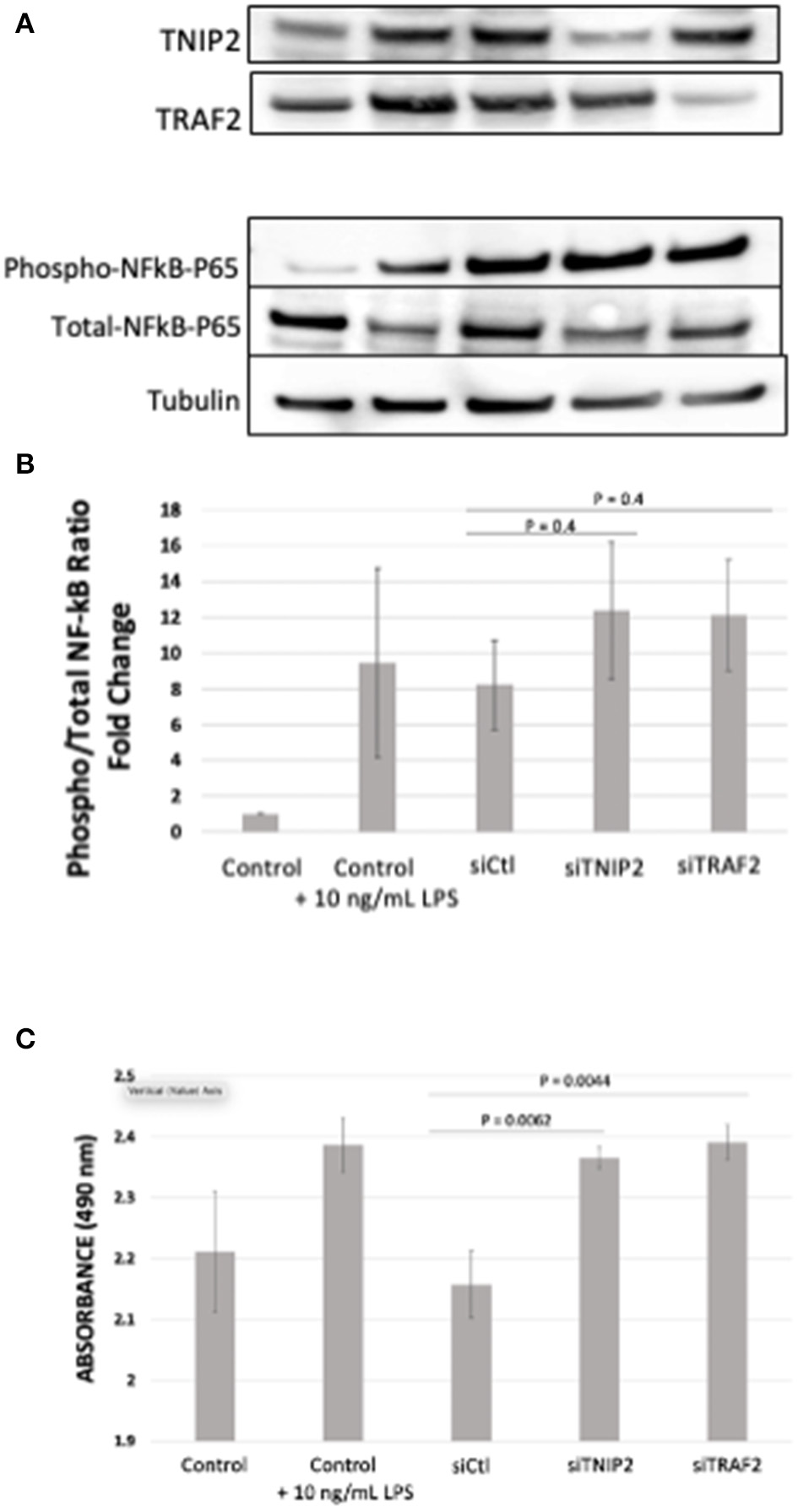 TNIP2 and TRAF2 are part of a gene network responsible for regulating the NF-κB pathway's signaling activity. The NF-κB proteins exist in the cytoplasm in an inactive state and can be rapidly activated in response to harmful stimuli such as oxidative stress, bacterial lipopolysaccharides, environmental toxins, and inflammation. Once activated, the NF-κB protein complex translocates to the nucleus and binds to target genes involved in cell proliferation, survival, and the production of cytokines that regulate innate and adaptive immune responses (34). Inappropriate NF-κB activation is associated with a wide range of diseases, including cancer, autoimmune conditions such as scleroderma, and PAH (35). Given that TNIP2 and TRAF2 serve to regulate NF-κB activity, we hypothesized that the loss of these proteins would lead to NF-κB overactivation.