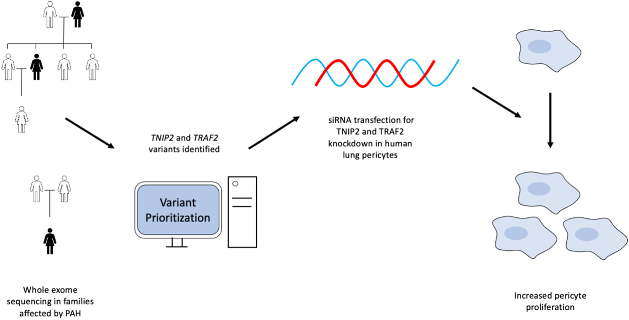 In this study, we utilized a WES custom gene prioritization method optimized to identify potentially pathogenic variants in PAH patients and family members to elucidate possible genetic mechanisms influencing disease development. This approach enabled the discovery of novel variants in TRAF2 and TNIP2, two genes involved in regulating the NF-κB pathway. We demonstrated that loss of TNIP2 and TRAF2 results in inappropriate NF-κB activation and increased proliferation of healthy lung pericytes through the use of siRNA-based knockdown. A graphical abstract is included in Figure 4. To our knowledge, ours is the first report to document a potential link between TNIP2/TRAF2 loss of function and PAH in humans.