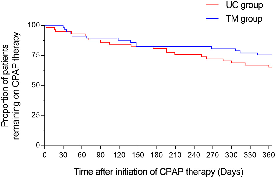 Normality of data was verified with Kolmogorov-Smirnov and Shapiro-Wilk tests. Data are presented as means [95% CI] or as frequency in percentages. Between-groups comparisons were performed by independent Student t-tests for continuous variables of chi-square tests for categorical variables. A two-way mixed analysis of variance with time (baseline, 3-month, 12-month) as within-subjects factor and group (UC vs. TM) as the between-subjects factor was conducted. We verified the equality of variance using the Mauchley's test of sphericity. If sphericity was violated, the Greenhouse-Geisser correction was used. Bonferroni method was used for post-hoc comparisons. The time at CPAP withdrawal was compared between groups using Kaplan-Meier plot analysis. A regression analysis was conducted to verify if sex or age were predictors of CPAP adherence at 12 months.