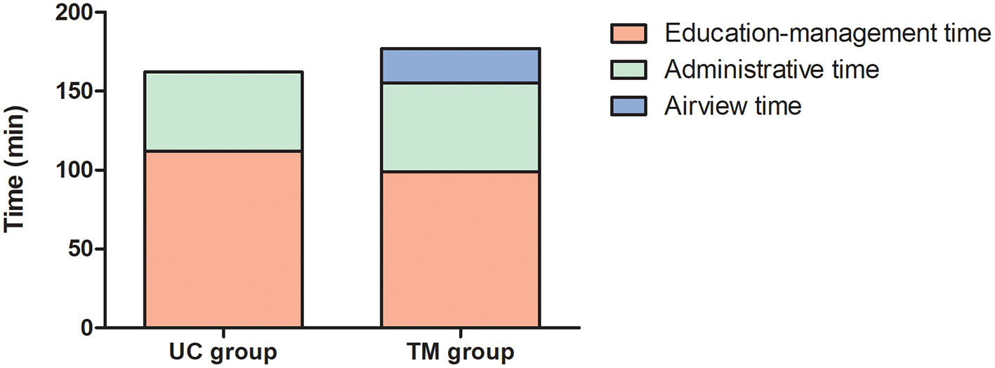 Mean healthcare time allocated in each group. Bar graphs represent the total consultation time allocated for participants randomized in the usual care (UC) and telemonitoring (TM) groups. Each bar is subdivided according to the amount of time spent for educational, administrative, or software management (Airview) purposes.
