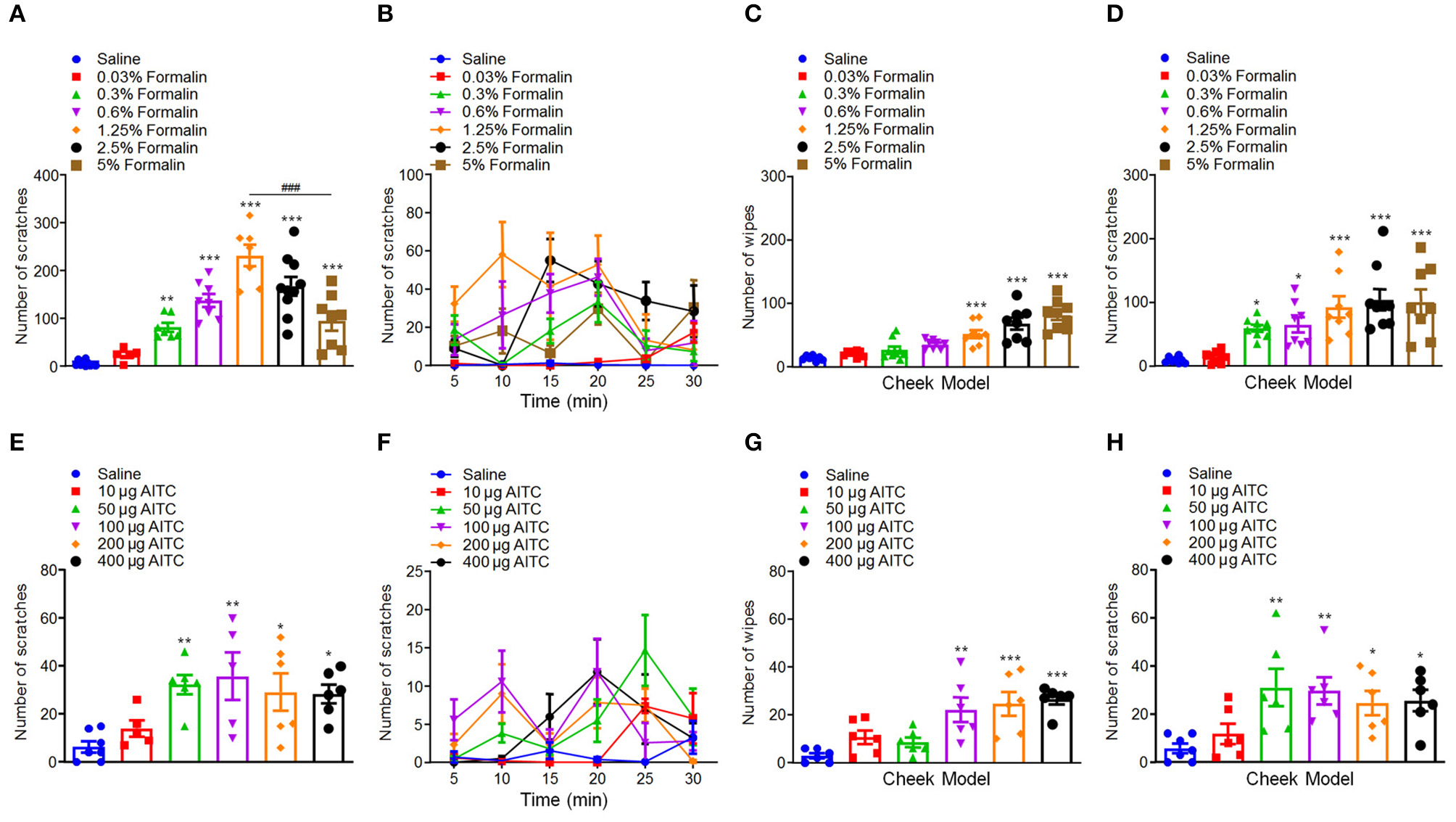Low-dose formalin evoked scratching behavior in the neck and cheek models of mice. (A,B) The total number (A) and time course (B) of scratching behavior induced by intradermal (i.d.) injection of the different doses of formalin (0.03–5%) in the nape of the neck in mice. (C,D) The total number of wiping (C) and scratching behavior (D) induced by i.d. injection of the different doses of formalin (0.03–5%) in the cheek in mice. (E,F) The total number (E) and time course (F) of scratching behavior induced by i.d. injection of the different doses of AITC (10–400 μg) in the nape of the neck in mice. (G,H) The total number of wiping (G) and scratching behavior (H) induced by i.d. injection of the different doses of AITC (10–400 μg) in the cheek in mice (*P < 0.05, **P < 0.01, ***P < 0.001 vs. Saline, ###P < 0.001 vs. 1.25% Formalin, one-way AVOVA following post-hoc Bonferroni's test and unpaired Student's t-test; n = 5–10). All data are expressed by means ± SEM.
