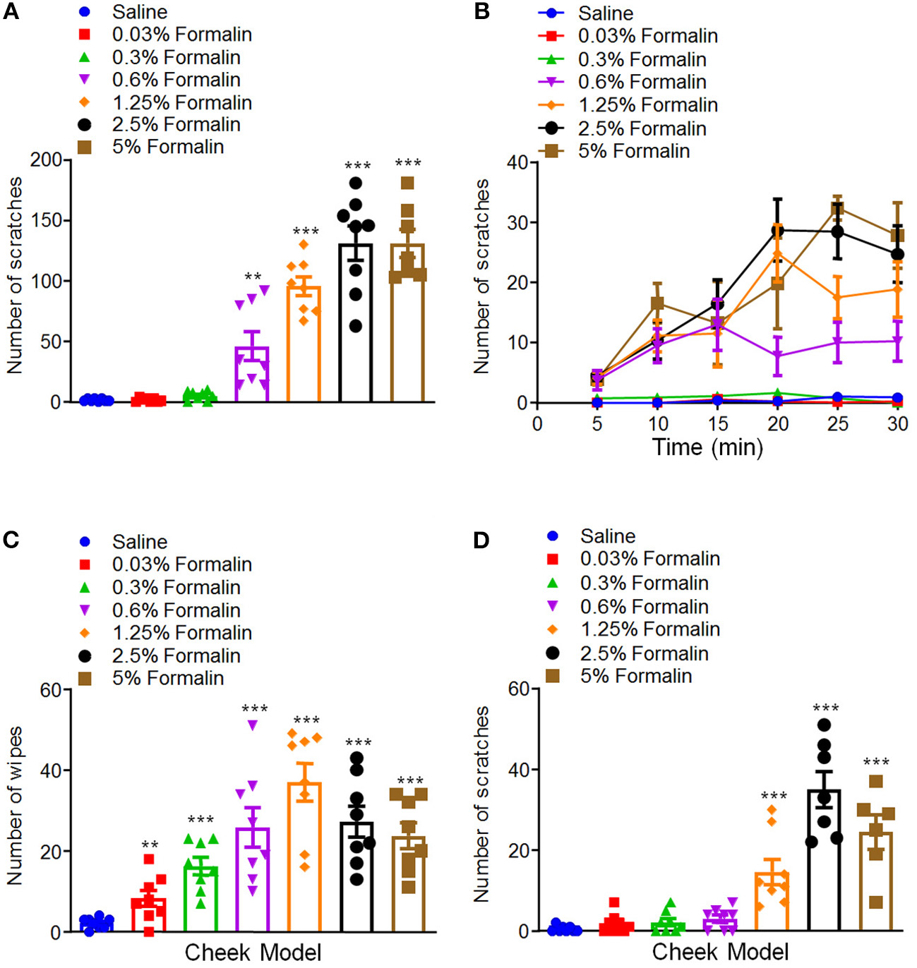 Low-dose formalin evoked wiping behavior in cheek model of rats. (A,B) The total number (A) and time course (B) of scratching behavior induced by i.d. injection of the different doses of formalin (0.03–5%) in the nape of the neck in rats. (C,D) The total number of wiping (C) and scratching behavior (D) induced by i.d. injection of the different doses of formalin (0.03–5%) in the cheek in rats (**P < 0.01, ***P < 0.001 vs. Saline, one-way AVOVA following Bonferroni's test; n = 6–8). All data are expressed by means ± SEM.