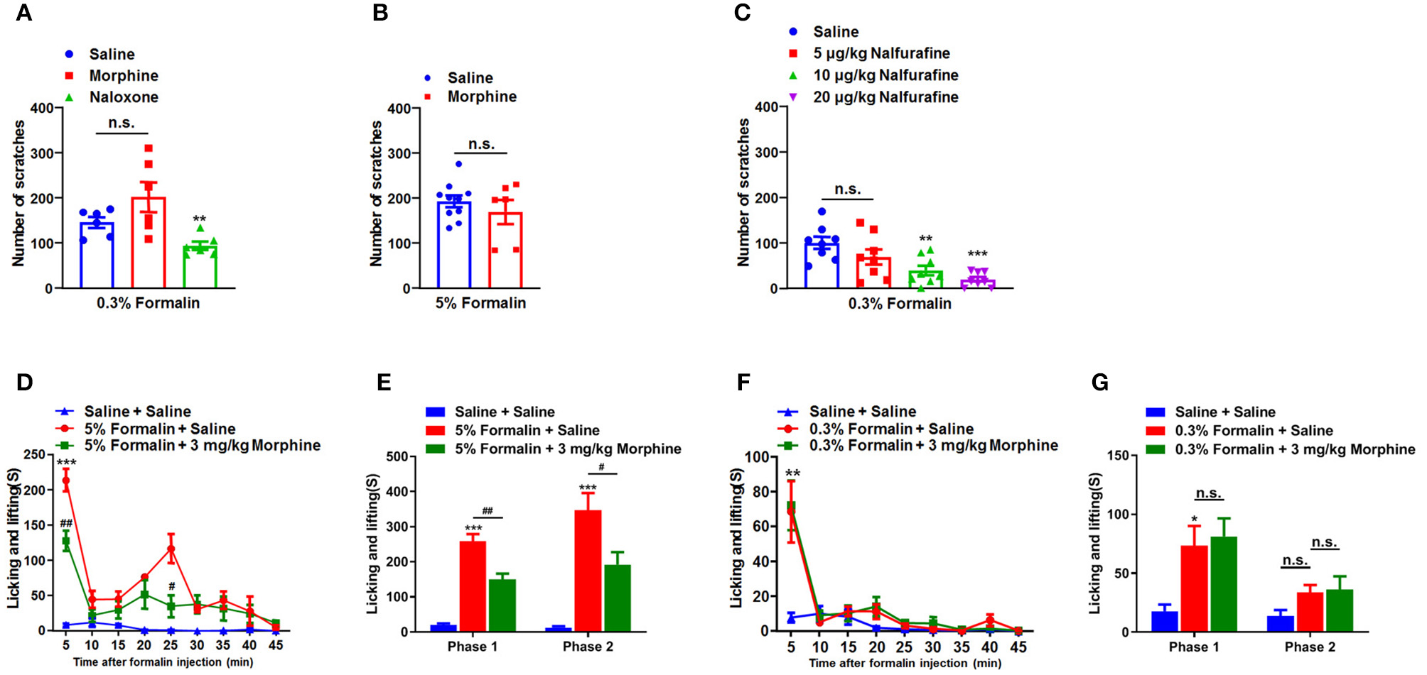 Opioid receptors were involved in the low-dose formalin-induced itch in mice. (A) The effects of systemic administration of morphine (1 mg/kg) and naloxone (1 mg/kg), on scratching behavior induced by 0.3% formalin in mice. (B) The effects of morphine (1 mg/kg) on 5% formalin-induced itch in mice (*P < 0.05, **P < 0.01, ***P < 0.001 vs. Saline, unpaired Student's t-test; n = 6–10). (C) The effects of systemic administration of nalfurafine on scratching behavior induced by 0.3% formalin in mice (*P < 0.05, **P < 0.01,***P < 0.001 vs. Saline, one-way AVOVA following Bonferroni's test; n = 8). (D,E) The time course (D) and total time (E) in nociceptive responses induced by i.pl. 5% formalin and the effects of intraperitoneal (i.p.) injection of morphine (3 mg/kg) on it (*P < 0.05, **P < 0.01,***P < 0.001 vs. Saline + Saline, #P < 0.05, ##P < 0.01, ###P < 0.001 vs. 5% Formalin + Saline, two-way ANOVA following post hoc Bonferroni test; n = 6–9). (F,G) The time course (F) and total time (G) in nociceptive responses induced by i.pl. 0.3% formalin and the effects of i.p. injection of morphine (3 mg/kg) on it (*P < 0.05, **P < 0.01,***P < 0.001 vs. Saline + Saline, #P < 0.05, ##P < 0.01 vs. 5% Formalin + Saline, unpaired Student's t-test; n = 6–9). All data are expressed by means ± SEM. n.s., not significant.