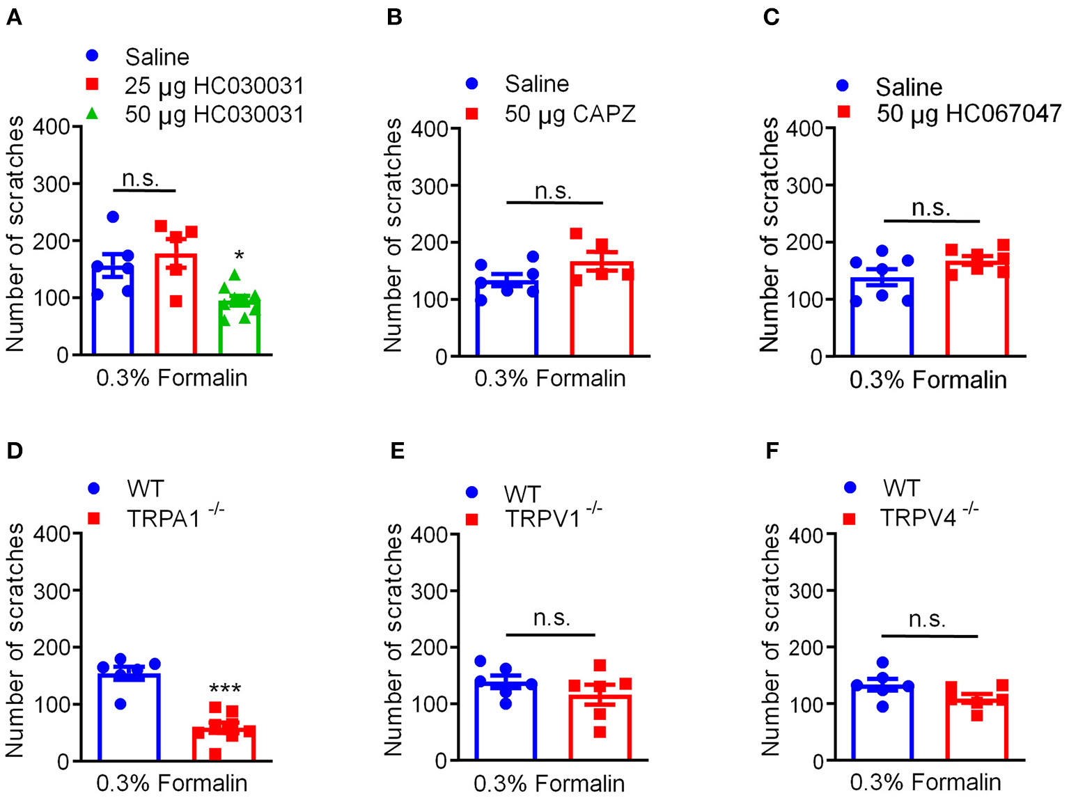 Activation of TRPA1 was required for 0.3% formalin-induced itch in mice. (A) The effects of co-administration TRPA1 blocker HC030031 on 0.3% formalin-induced itch in mice. (B) The effects of co-administration TRPV1 blocker capsazepine on 0.3% formalin-induced itch in mice. (C) The effects of co-administration TRPV4 blocker HC067047 on 0.3% formalin-induced itch in mice. (D–F) 0.3% formalin-induced acute itch in mice was abolished in Trpa1−/− mice (D), but neither in Trpv1−/− mice (E) nor in Trpv4−/− mice (F) [*P < 0.05, ***P < 0.001 vs. 0.3% Formalin, one-way AVOVA following Bonferroni's test; n = 5–9, A; *P < 0.05, **P < 0.01, ***P < 0.001 vs. 0.3% Formalin, WT, unpaired Student's t-test; n = 5–9, (B–F)]. All data are expressed by means ± SEM. n.s., not significant.