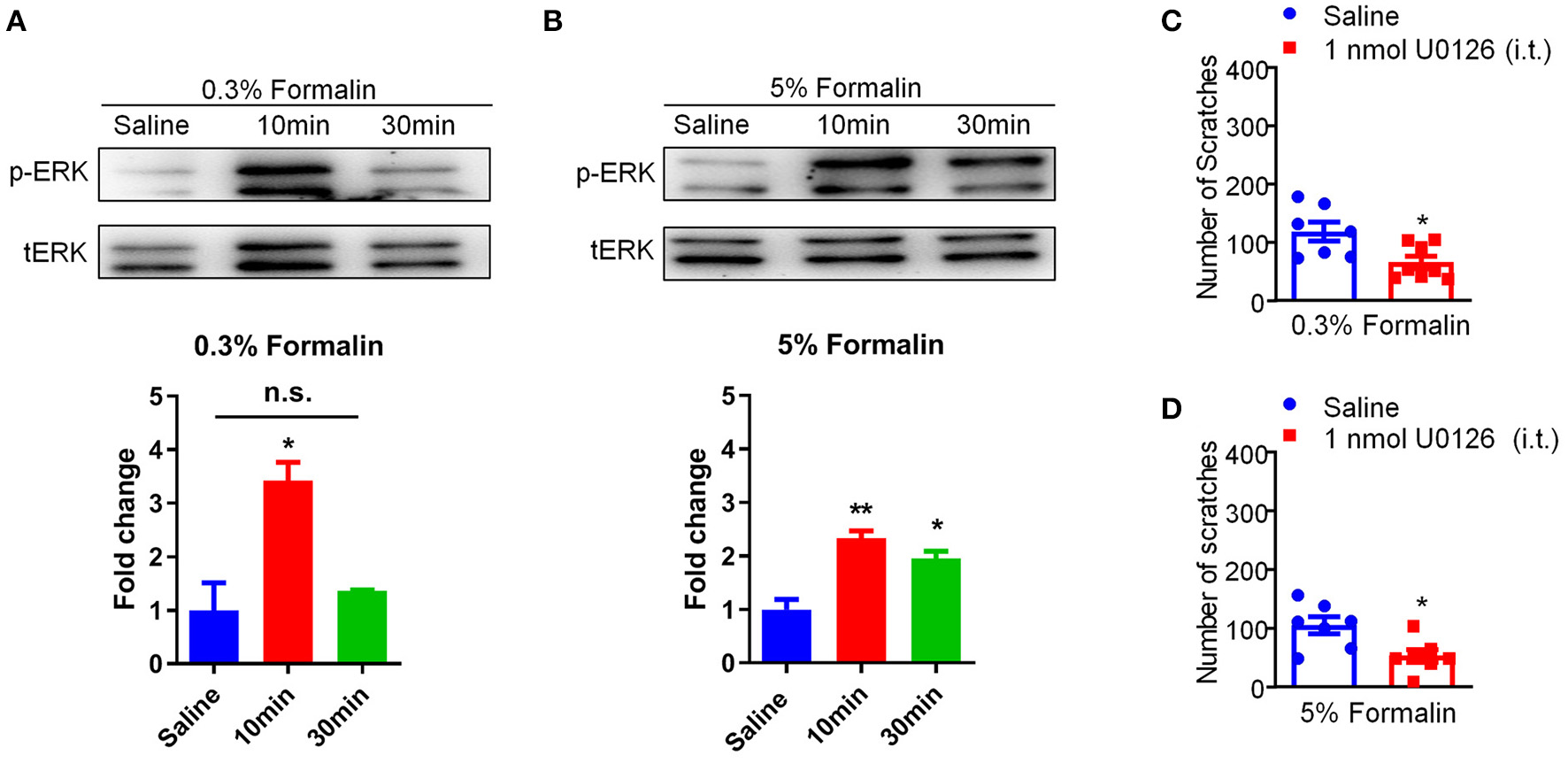 Activation of p-ERK in the DRGs was involved in low-dose formalin-induced itch in mice. (A,B) Western blots (upper panel) and quantification (lower panel) showing that p-ERK expression was significantly increased in 10 min and 30 min in the DRG after i.d. injection of 0.3% (A) and 5% formalin (B) (*P < 0.05, **P < 0.01 vs. Saline, unpaired Student's t-test; n = 3). (C,D) Intrathecal (i.t.) injection of U0126 (1 nmol) decreased both 0.3% (C) and 5% formalin (D)-induced scratching behavior in mice (*P < 0.05, **P < 0.01 vs. Saline, unpaired Student's t-test; n = 7–8). All data are expressed by means ± SEM. n.s., not significant.