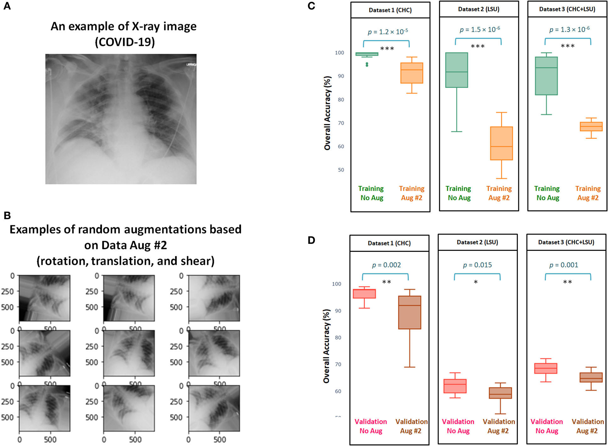 Figure 2A shows and example of X-ray image for a subject diagnosed with COVID-19 using PCR. Examples of random outputs for applying Augmentation 2 to Figure 2A are shown in Figure 2B. The overall training accuracy with Augmentation 2 is significantly lower (p << 0.0001 in all datasets) than the training accuracy without any augmentation method over three datasets, as shown in Figure 2C. However, the same finding was observed over the validation accuracy, with significance (p = 0.002, p = 0.015, p = 0.001, for Dataset 1, Dataset 2, Dataset 3, respectively), as shown in Figure 2D. Over three datasets, it is clear that Augmentation 2 helps prevent overfitting, however, it does not help with generalization compared to models without augmentation.