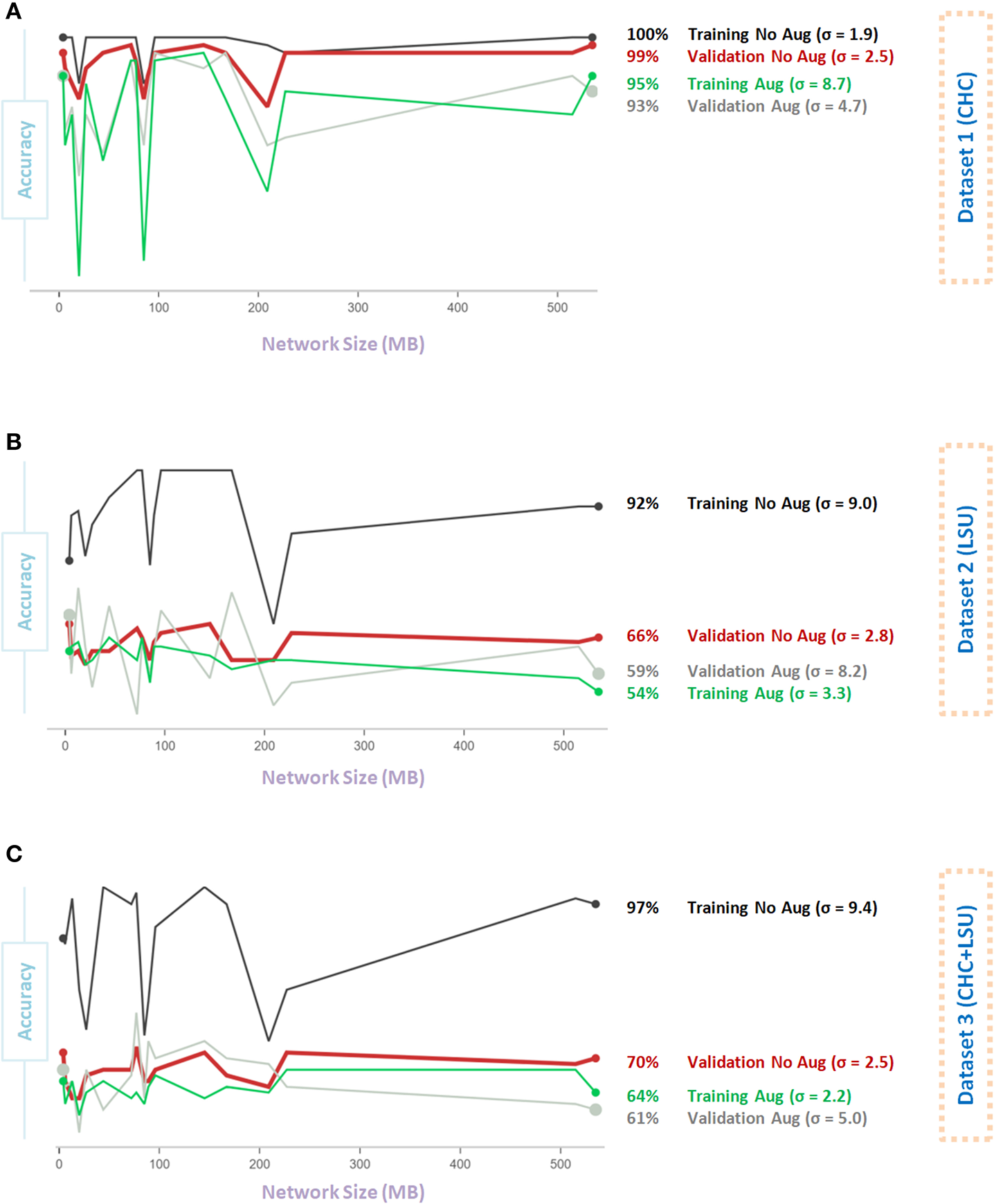 Figure 5A shows that Data Augmentation 4 was relatively stable (σ = 2.5) regardless of the network size over the CHC dataset. Over the CHC, LSU, and CHC+LSU, the larger the network size, the accuracy of models with Data Augmentation 4 could get higher than without augmentation, as shown in Figures 5A–C. However, it is not a stable result, as σ = 4.2 and σ = 8.3 with augmentation compared to σ = 4.2 and σ = 8.3 without the augmentation step on Dataset 1 and Dataset 2, respectively. In other words, one large network size can improve the overall validation accuracy with augmentation 4. However, it does not mean that Data Augmentation 4 will have the same (or similar) effect using a different network. Stability over different sizes is vital to evaluate the impact of the data augmentation method.