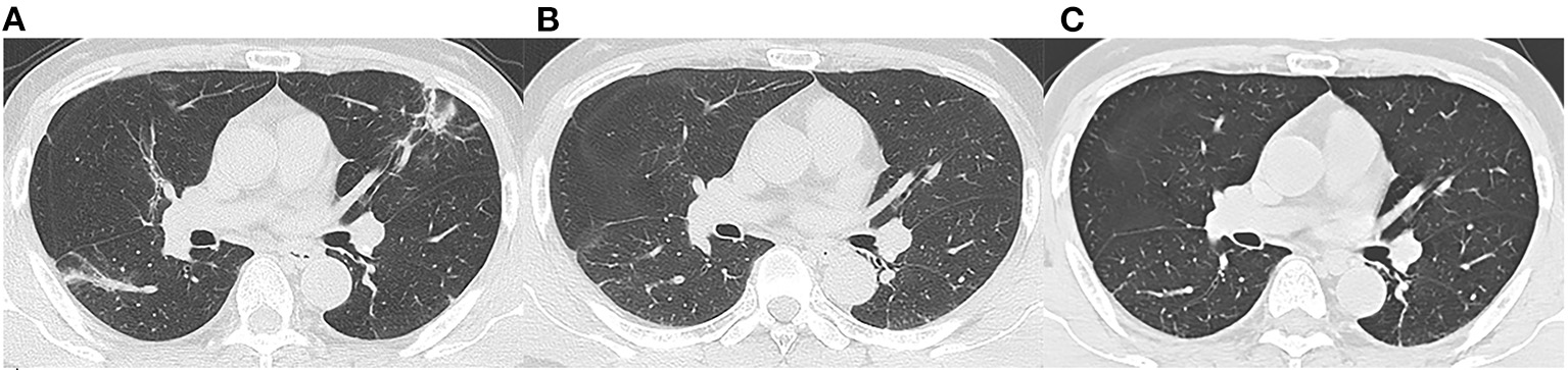Follow-up chest CT images of a 52-year-old male with COVID-19. (A) At discharge, CT imaging shows parenchymal bands, irregular interfaces, and traction bronchiectasis in left upper lobe and right lower lobe. The lesions are almost revolved on the 3-month follow-up (B) and 7-month follow-up (C) CT. This patient was enrolled in non-fibrosis group.