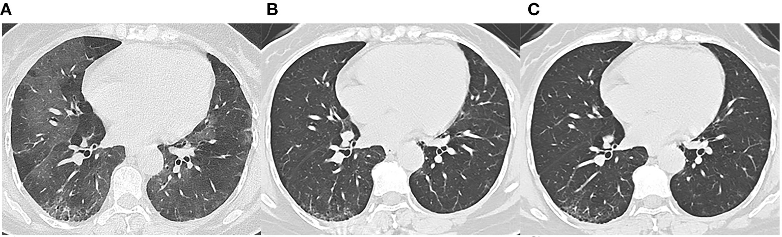 All the patients were imaged with a multi-detector CT scanner (uCT 510, United Imaging, China) using the following parameters: 120 kVp, 150 mA, 1.5 mm collimation, reconstruction matrix of 512 × 512, and slice thickness of 1.0 mm. All the patients were scanned in a supine position with a single inspiratory phase. The scanning range included the whole chest from the first ribs to the diaphragm. All the patients were examined without injection of contrast media. Images were obtained with mediastinal (width, 400 HU; level, 30 HU) and parenchymal (width, 1600 HU; level, −600 HU) window settings. We reviewed three chest CT scans for each patient: the CT examination at discharge, the CT examination at 3 months after discharge, and the CT examination at 7 months after discharge.