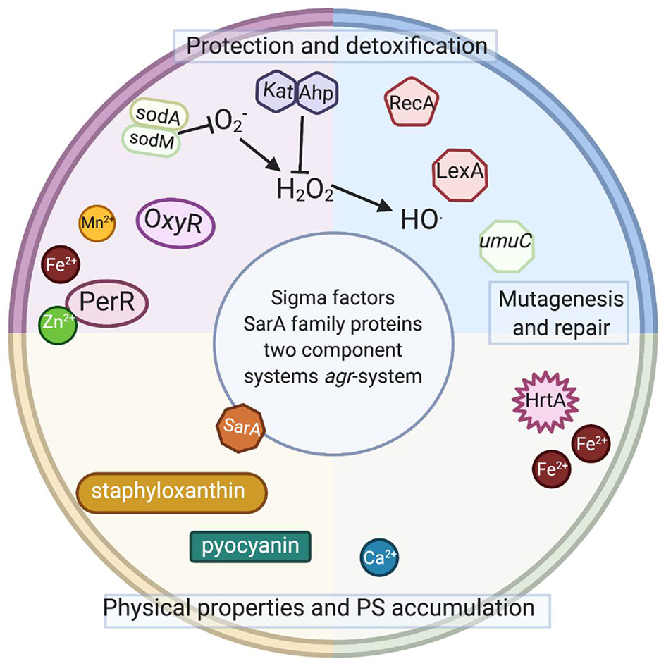 Intracellular elements involved or potentially involved in photodynamic inactivation. Schematic representation of intracellular elements that were studied with respect of photodynamic inactivation of bacteria. Sod, superoxide dismutase; OxyR, PerR, peroxide-responsive regulators in gram-positive and gram-negative species; Kat, catalase in gram-positive and gram-negative species; Ahp, alkyl hydroperoxide reductase in gram-positive and gram-negative species; RecA, recombinase A; LexA, SOS system repressor, umuC, gene coding for an error-prone polymerase in gram-positive and gram-negative species; HrtA, heme-regulated transporter A in S. aureus; SarA, transcriptional regulator in S. aureus; agr, virulence accessory gene regulator in S. aureus. Staphyloxanthin (membrane embedded) and pyocyanin (secreted) are dyes produced by S. aureus and P. aeruginosa. Please see the text for detailed explanations (Created with BioRender).