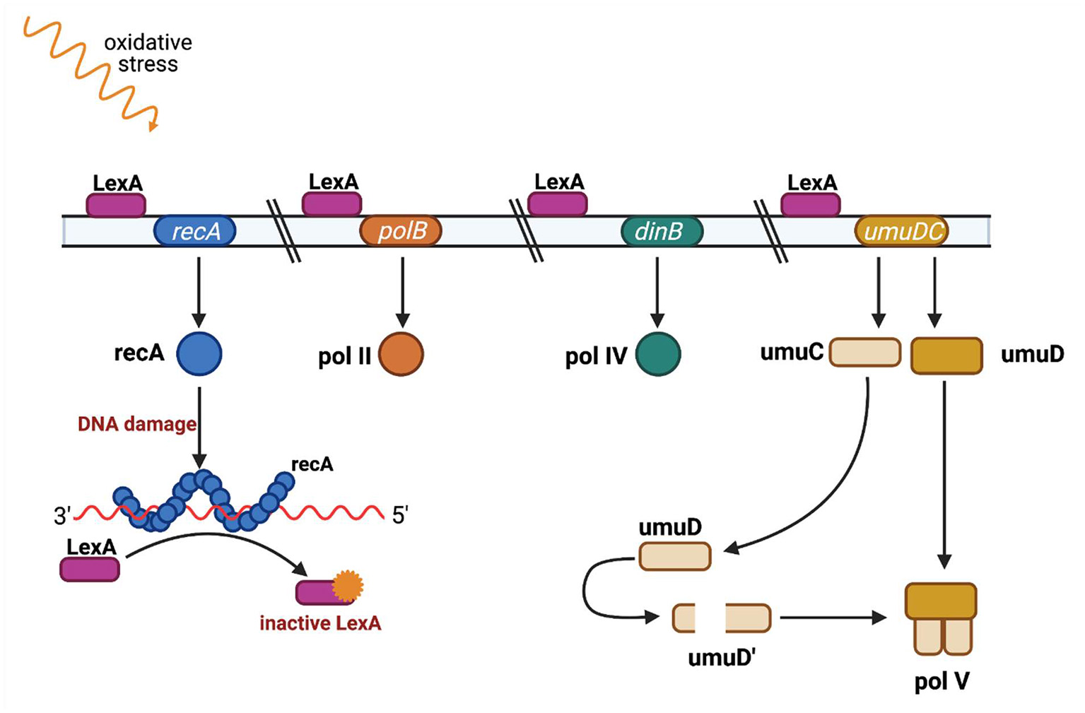 SOS regulation. The LexA protein is attached to an operator upstream of the SOS response genes and blocks their transcription. Single-stranded DNA fragments (ssDNA) accumulate when DNA is damaged (eg. as a result of UV radiation or ciprofloxacin). RecA protein binds to single-stranded DNA fragments to form nucleoprotein fibers that stimulate the SOS response. The active form of RecA protein interacts with the LexA repressor and causes LexA to dissociate from the operator. When LexA is not attached to an operator, genes responsible for DNA repair are transcribed, such as polB gene encoding polymerase II, dinB gene encoding polymerase IV, and the umuC and umuD genes encoding proteins UmuC and UmuD, which are subunits of polymerase V. Polymerases IV and V replicate damaged DNA. Adapted from Tropp (31). (Created with BioRender).