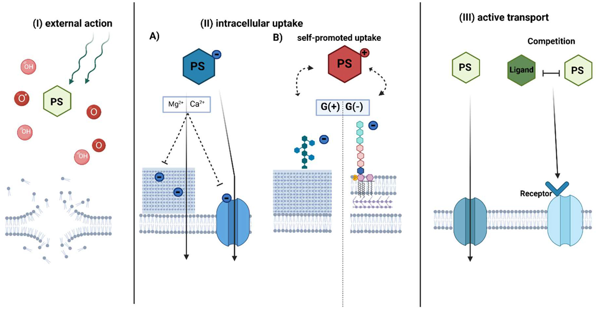 Proposed mechanisms of photosensitizer accumulation in aPDI treatment. The photosensitizer uptake mechanism can be divided into three general pathways: (I) external action, (II) intracellular action, and III) active transport-dependent accumulation. In the external action (I), PS does not accumulate inside the bacterial cell, however, due to the diffusion length of generated ROS (OH) or singlet oxygen (O*) upon irradiation, it causes the membrane disruption. The intracellular action (II) depends on the PS charge. (A) Anionic PS is accumulated by electrostatic interactions or active transport. The addition of divalent cations neutralizes negative charge on the bacterial envelope and promotes uptake of negatively charged PS through membranes. (B) Cationic PSs use mechanism known as “self-promoted uptake.” The positively charged compound is bound to the negatively charged teichoic acids on the peptidoglycan of the G(+) or lipopolysaccharides on the outer membrane of G(-) bacteria. The photosensitizer is associated with the surface layer, while after photosensitization it promotes cell disruption. In active transport (III), PS is taken up inward through a membrane protein channel such as porins or by mimicking receptor binding due to structure similarity to its natural ligand. PS-photosensitizer, O*- singlet oxygen, OH- radicals referred in general as ROS. (Created with BioRender).