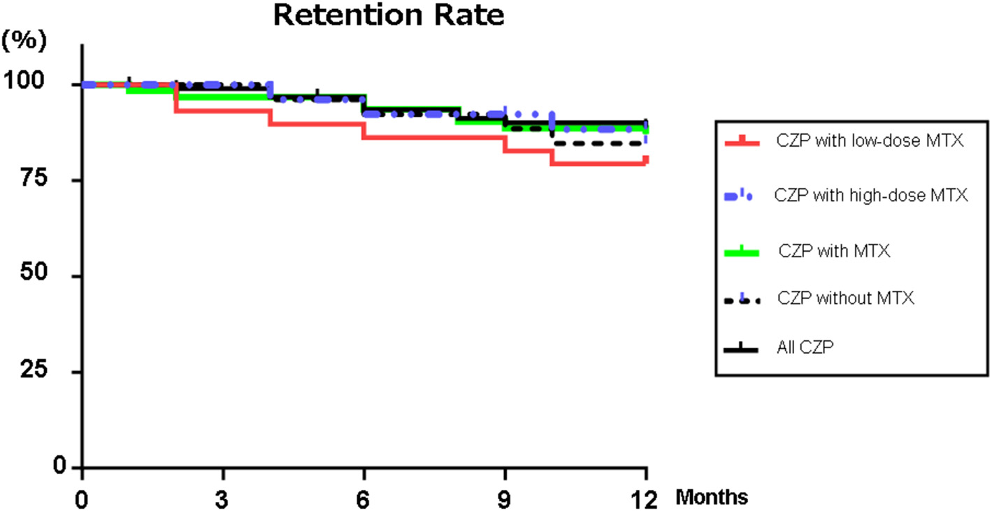 Patients and Methods: We divided Japanese RA patients treated with CZP (n = 95, 25–83 years old) into groups based on those with (n = 65) and without (n = 30) concomitant MTX and those treated with a high dose (≥8 mg, n = 41) or low dose (1– <8 mg, n = 24) of MTX. We retrospectively analyzed the concomitant MTX doses' effects and side effects and the patient retention rate.