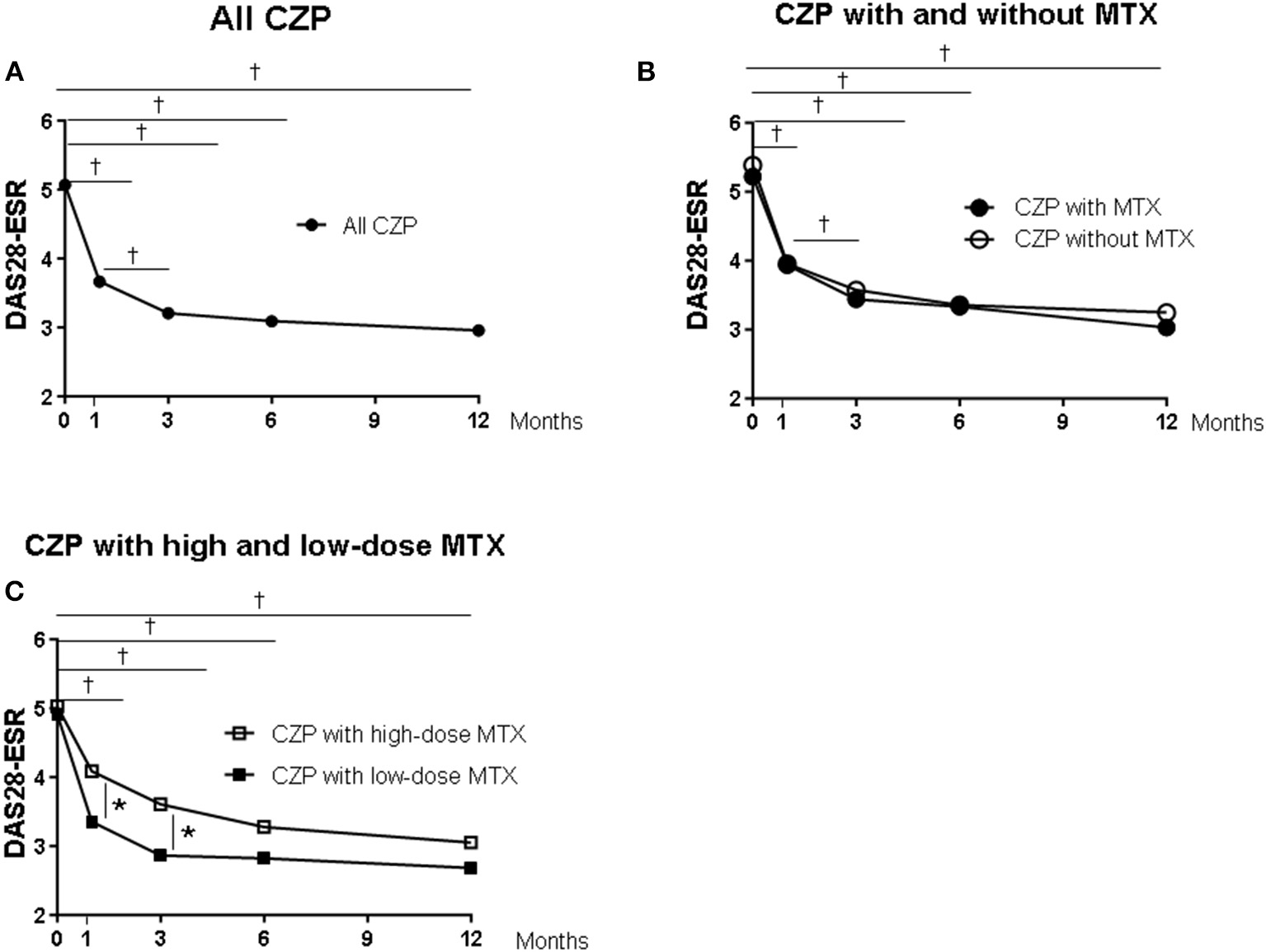 Clinical and laboratory data from baseline in certolizumab pegol (CZP) without and with methotrexate (MTX) in the clinical course. Serial changes in DAS28-ESR from baseline in (A) all CZP treatments, (B) with and without MTX, and (C) the low- and high-dose MTX. *p < 0.05 and †p < 0.001, baseline vs. the value at 1, 3, 6, and 12 months. DAS28-ESR, Disease Activity Score assessing 28 joints with erythrocyte sedimentation rate.