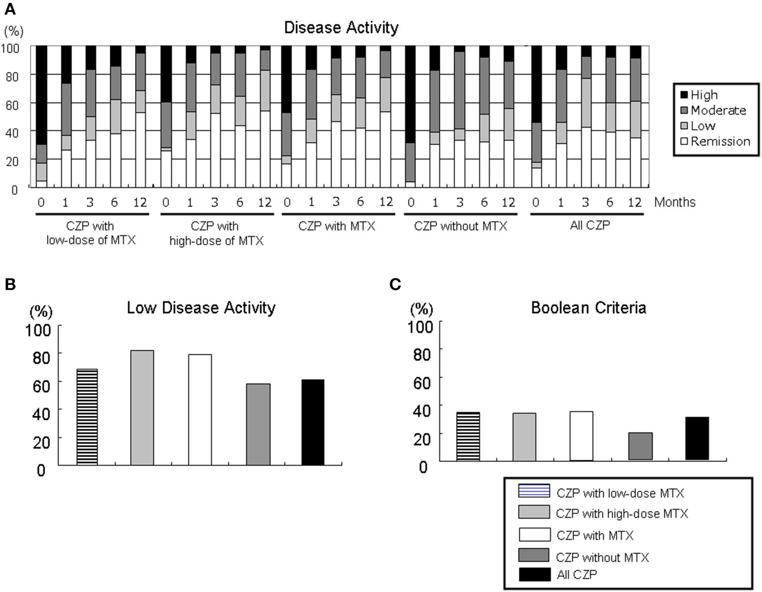 Disease activity in DAS28-ESR and ACR/EULAR Boolean-based criteria. By comparing the RA patients' DAS28-ESR scores at baseline and at 1, 3, 6, and 12 months, it is possible to define (A) disease activity, (B) low disease activity including remission, and (C) Boolean-based criteria in RA patients with the low- and high-dose MTX, with MTX, and without and with MTX, and all CZP treatments. The disease activity and criteria in DAS28-ESR were categorized as follows. DAS28 criteria: â– high: 5.1 <DAS28;