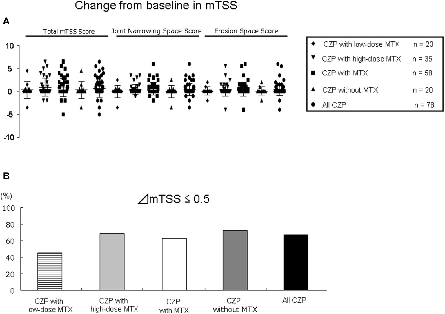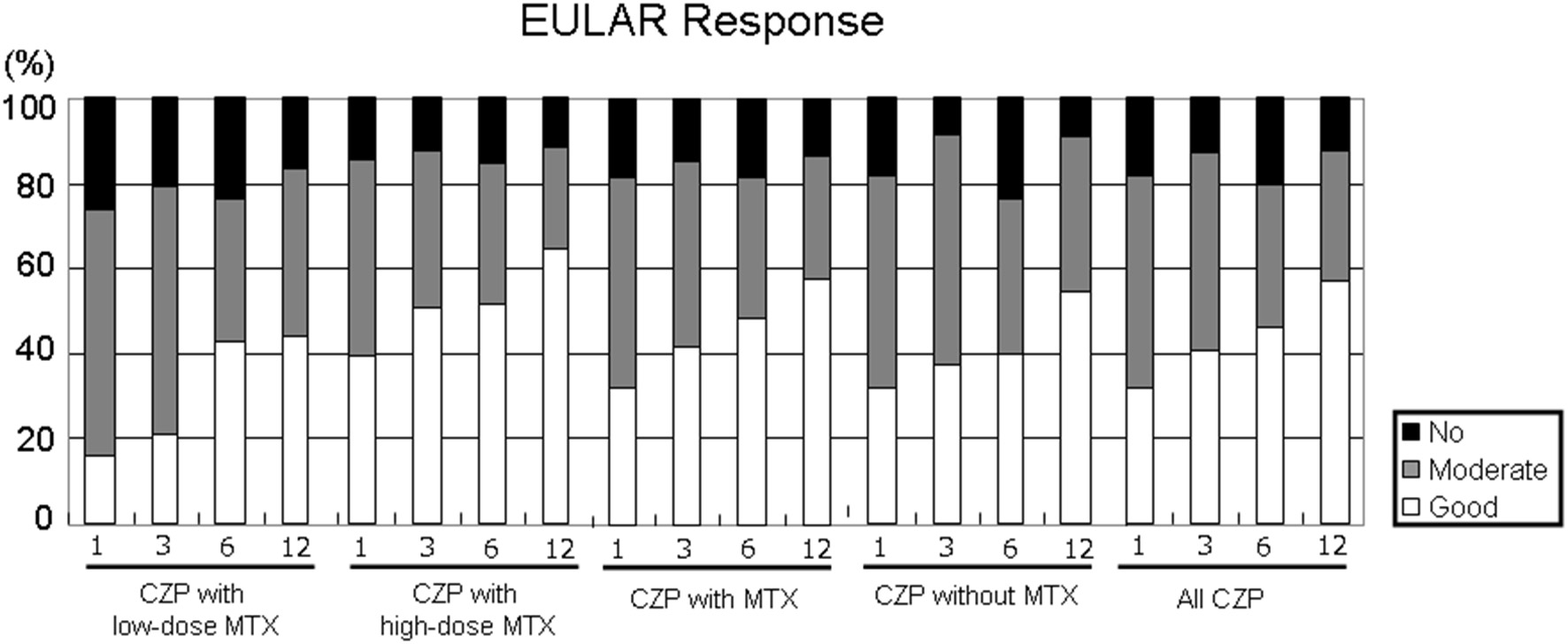 Results: There were no significant differences among the CZP groups with and without MTX or the groups receiving the high vs. low MTX doses in the retention rate, the low disease activity rate, or the inhibitory effect in radiographic joint damage.