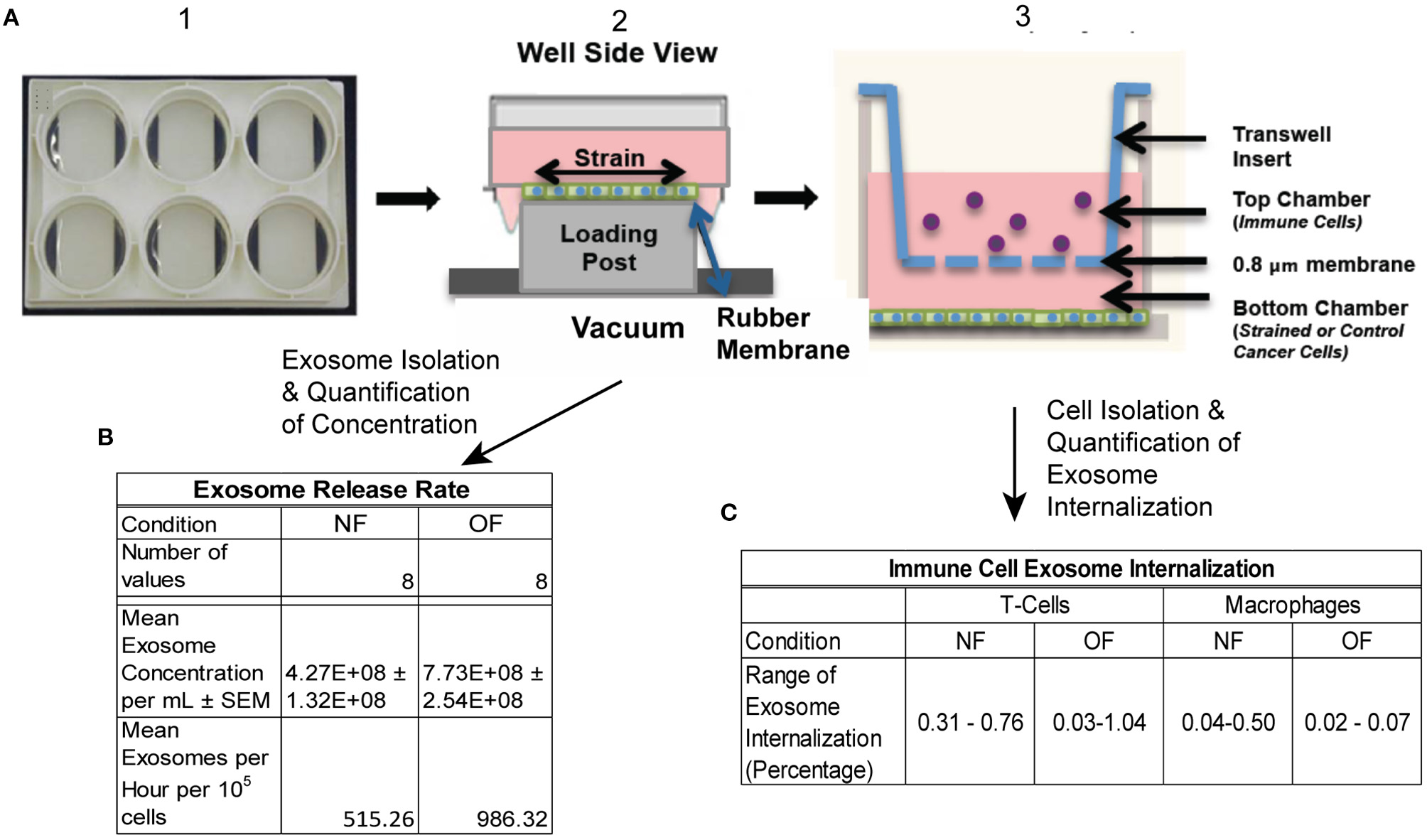 Schematic of experimental protocol. (A) 4T1.2 cells were seeded in BioFlex plates (1), once cells reached confluence they were exposed to OF strain (or NF) (2). Strain exposed (or NF) cells were either put into co-cultured with immune cells (T cells and macrophages) using transwell (3) or conditioned media was collected for exosome isolation. (B) Exosome release rate quantified following OF or NF. n = 8 per condition from 3 experiments, 2–3 replicates per experiment. (C) Exosome internalization by T cells and macrophages was quantified using Imagestream flow cytometry, n = 2–3 per condition.