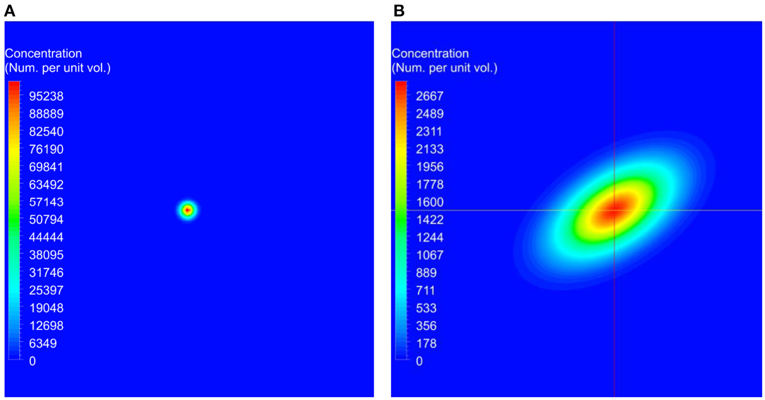 The initial conditions used for the benchmark simulations and the predicted concentration at the end of the simulation. In these figures, red represents higher concentrations and blue represents lower concentrations. (A) Initial concentration used at the beginning of the simulation. (B) Computed concentration after 45 min.