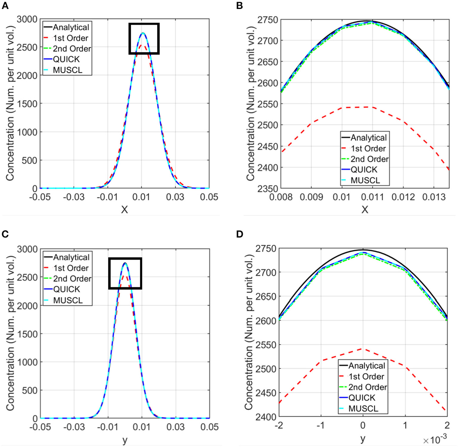 Comparison of computed concentrations using different numerical schemes with the analytical solutions. Simulations were conducted using first order, second order upwind, second order QUICK, and third order MUSCL schemes for the discretization of the spatial derivatives in the transport equation (37–39). Computed concentrations are compared with the analytical results along the horizontal and vertical lines shown in Figure 2B. (A) Comparison of the concentration along the horizontal line. (B) Zoomed in view of the comparison in the rectangle marked in (A). (C) Comparison of the concentration along the vertical line. (D) Zoomed in view of the concentration in the rectangle marked in (C).