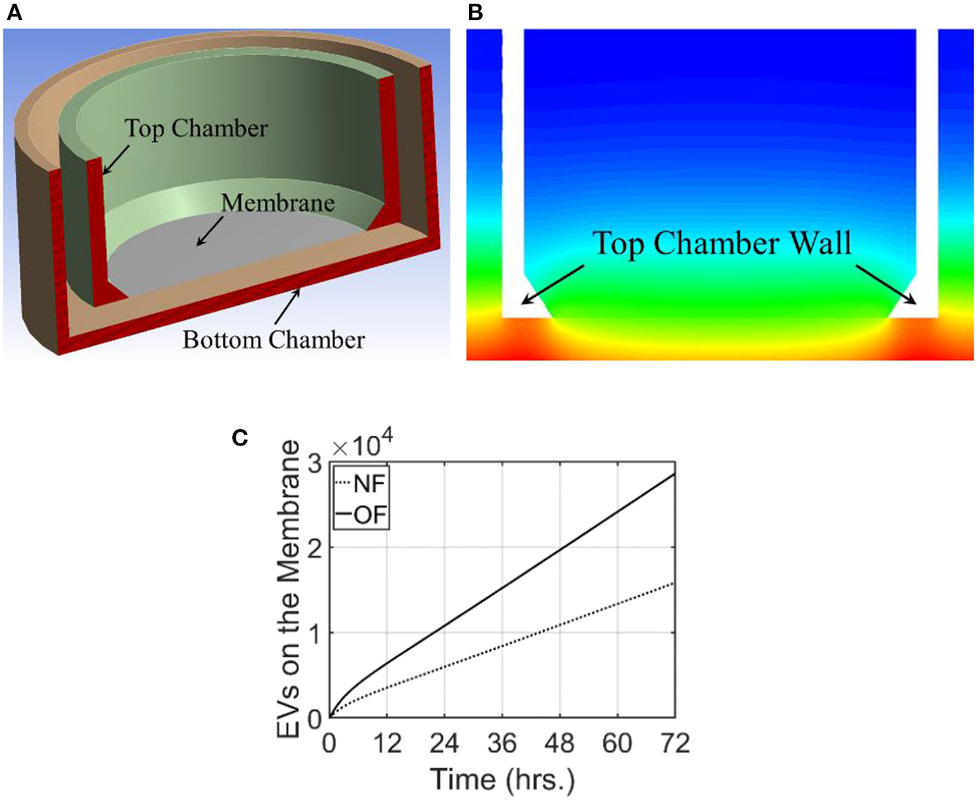 Computational domain and the results from modeling of exosome transport in a transwell. For this modeling, exosome release rate for the cells placed at the bottom surface is taken as 515.3 and 986.3/h./105 cells for NF and OF, respectively. (A) A cross-sectional view of the 3-dimensional computational domain used for the simulation. (B) Exosome gradient on a plane through the middle of the transwell for NF after 72 h. (C) A comparison of the number of exosomes at the membrane for NF and OF groups as a function of time.