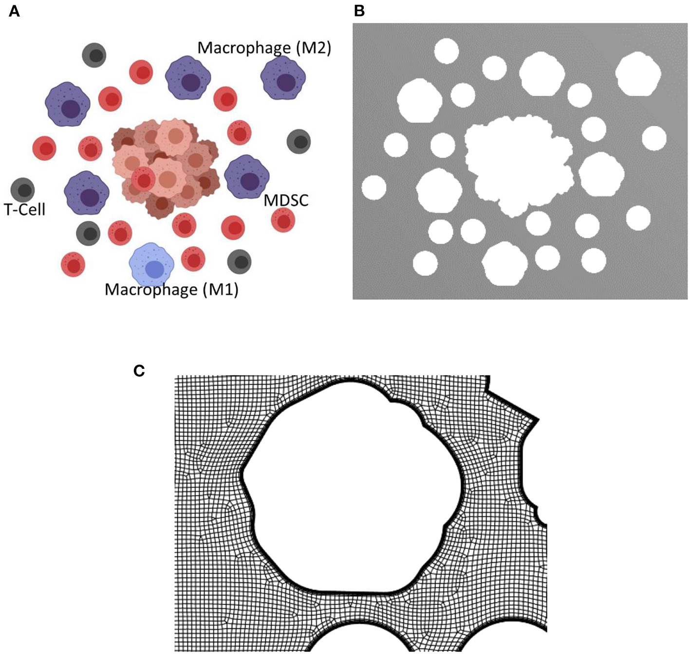Biorender image, computational domain, and a view of the mesh for the tumor microenvironment with macrophages, T cells, and MDSCs. The tumor microenvironments used for the simulations are created using Biorendor (48), and the rendered images is segmented to extract the geometry of various cell types in the computational domain. (A) Rendered image using Biorender. (B) Extracted computational domain using image processing techniques. (C) A zoomed in view of the mesh in TME used for the computational simulation.