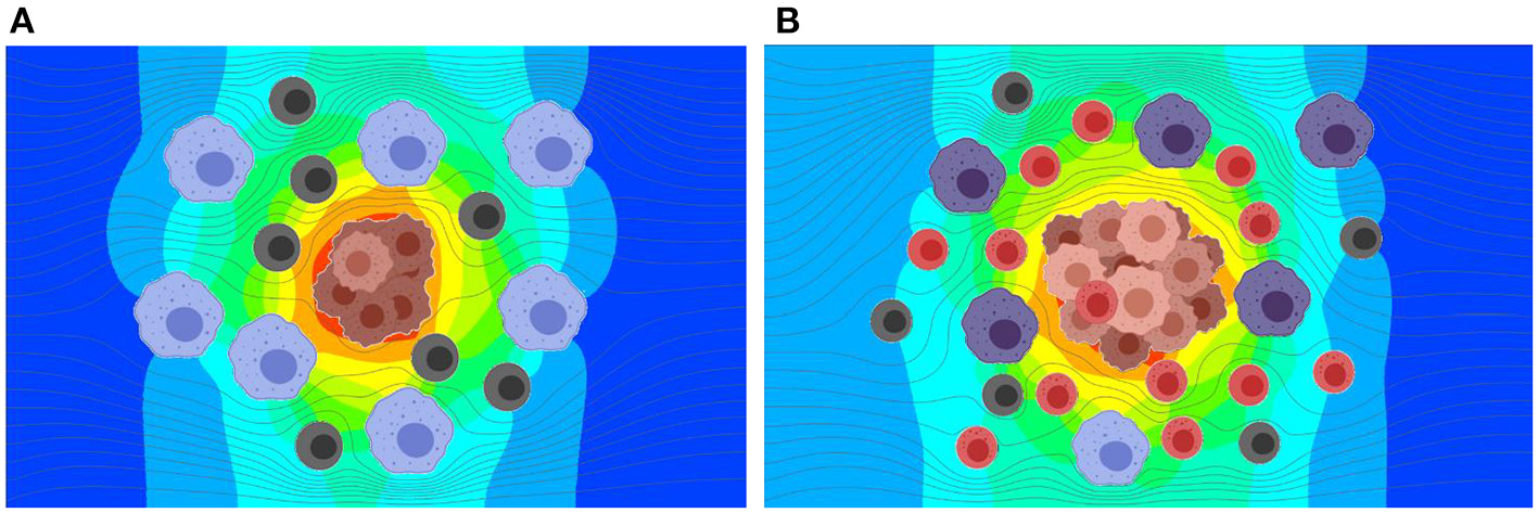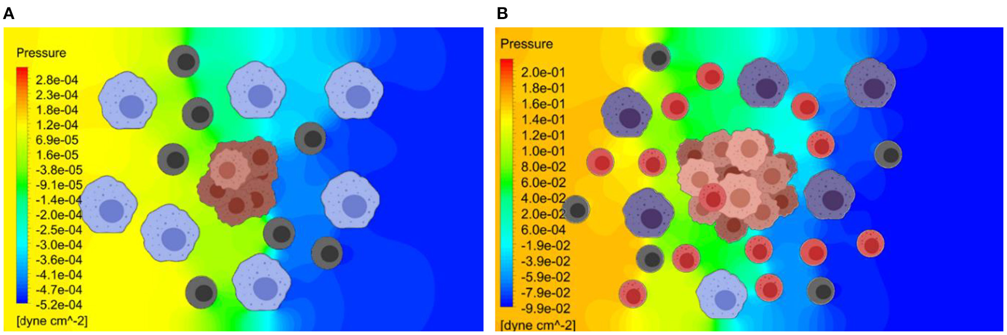 Pressure distribution in the TME at the early and later stages of tumor growth. The Navier-Stokes equations are used to estimate the interstitial fluid flow velocities and the pressure distribution within TME. (A) Predicted pressure distribution at early stage. (B) Predicted pressure distribution at later stage. The predicted pressure distribution is greater for the later stage of the tumor growth, due to greater obstruction for the flow by a larger tumor.