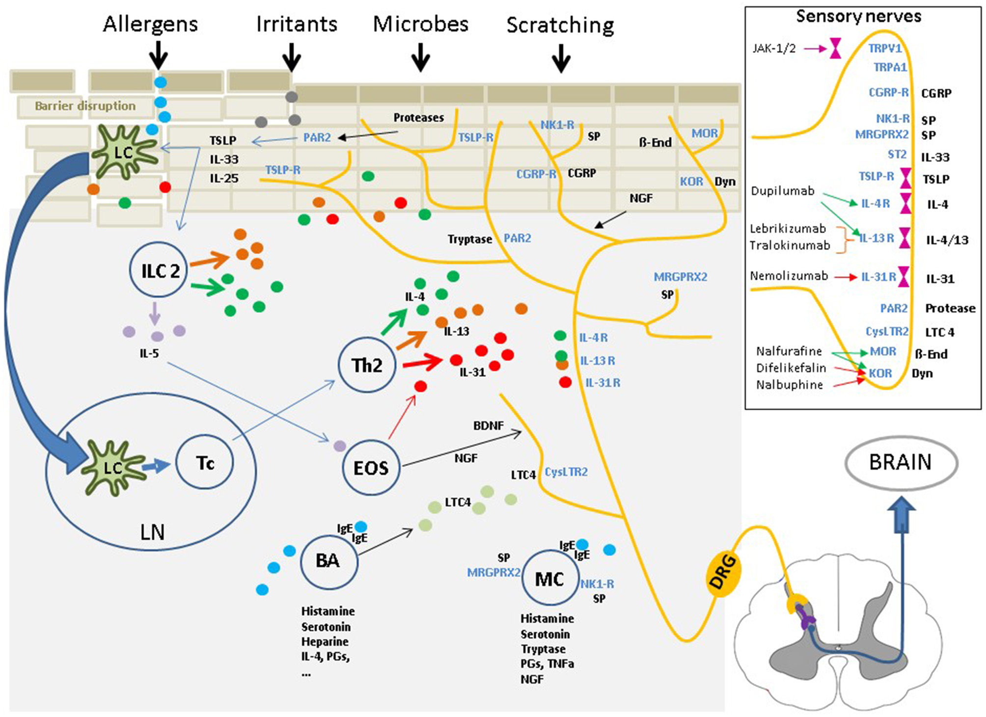 The cutaneous neurosensory system occupies a central position within the “pathophysiological triangle” of epidermal barrier disruption, immune dysfunction, and environmental impacts due to external stimuli. The cutaneous sensory nerves are in close contact with resident and infiltrating cells and are affected by a myriad of mediators from these cells. Upon stimulation, the signal is mediated via pruriceptive nerve fibers and the dorsal root ganglia extending to the dorsal horn of the spinal cord. From there, the signal is transferred via interneurons to fibers of the lateral spinothalamic tract, which cross over to the contralateral side, extend up to the thalamus and, finally, reach multiple brain regions, where the nervous signal is perceived as an itching sensation, and scratching is induced. Insert: Multiple itch transmitting receptors are located on sensory nerve fibers, some of which are associated with intracellular Janus kinases. Targeting these receptors or the intracellular Janus kinases with specific inhibitors has shown to have significant antipruritic effects. IL, interleukin; TSLP, Thymic stromal lymphopoetin; NK1-R,neurokinin-1 receptor; CGRP/-R, Calcitonin gene-related peptide /-receptor; MRGPRX2, Mas-related G-protein coupled receptor X2; IgE, Immunoglobulin E; PAR2, Protease activated receptor 2; TRPV1/A1, Transient receptor potential vanilloid 1/ankyrin 1 channel; LTC4, leukotriene C4; CysLTC4, LTC4 receptor; MOR, mu-opioid receptor; KOR, kappa-opioid receptor; Dyn, Dynorphin; ß-End, ß-Endorphin; SP, substance P; ST2, IL-33-receptor.