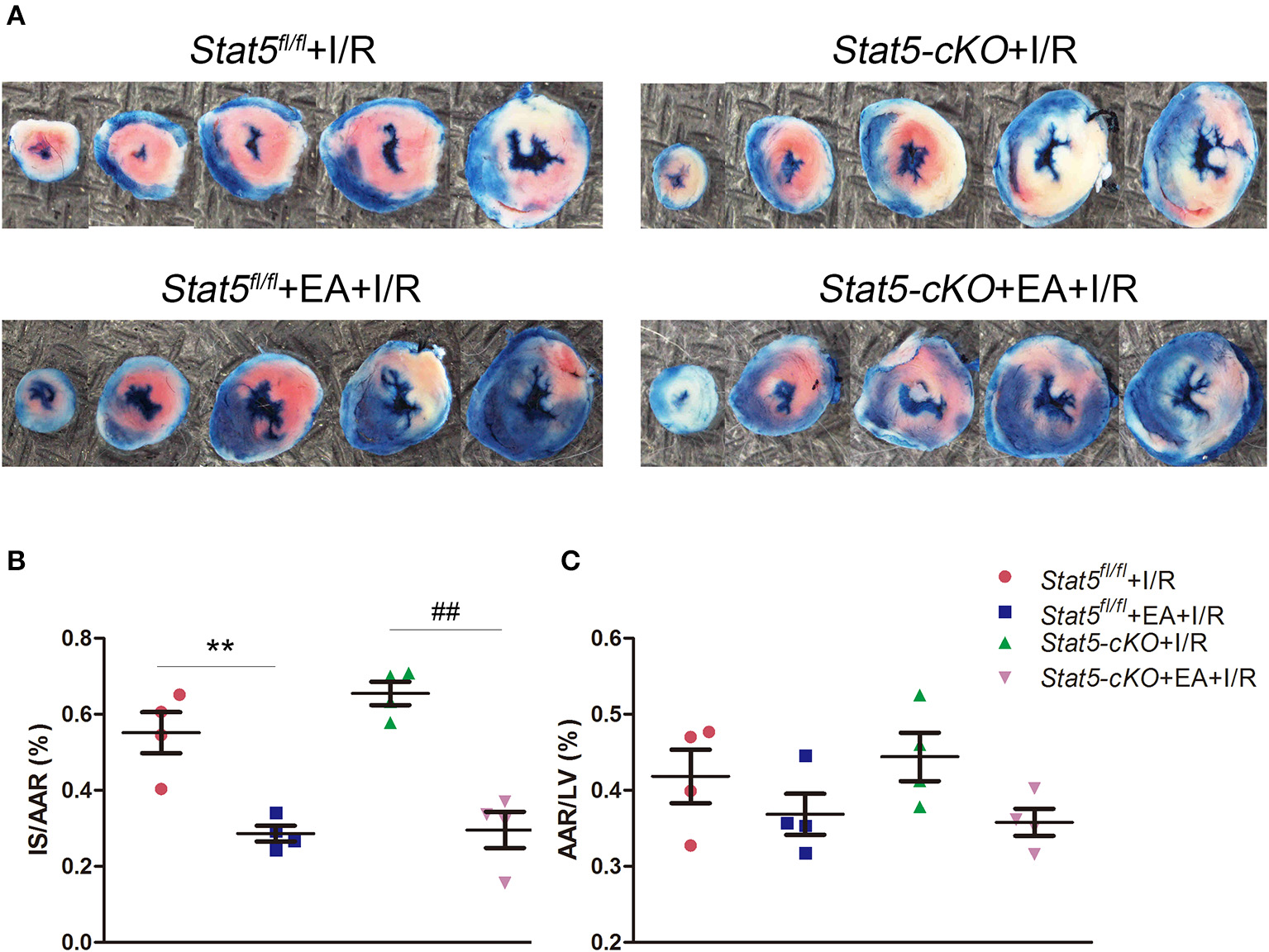 Acupuncture reduced myocardial infarct size. (A) Evans blue/TTC double staining was used to measure the ischemic infarct area and area at risk (AAR). (B) The infarct size (IS)/AAR ratio was calculated and presented as a percentage. Data are presented as means ± SEM. Normal tissues are stained blue, ischemic infarct areas and AARs are pale white or red. **P < 0.01 compared with Stat5fl/fl+I/R group; ##P < 0.01 compared with Stat5-cKO+I/R group. (C) The ratio of AAR/total left ventricular (LV) area was calculated and presented as a percentage. There was no difference between the groups. Data were analyzed by one-way ANOVA with Tukey's post-hoc correction, n = 4.