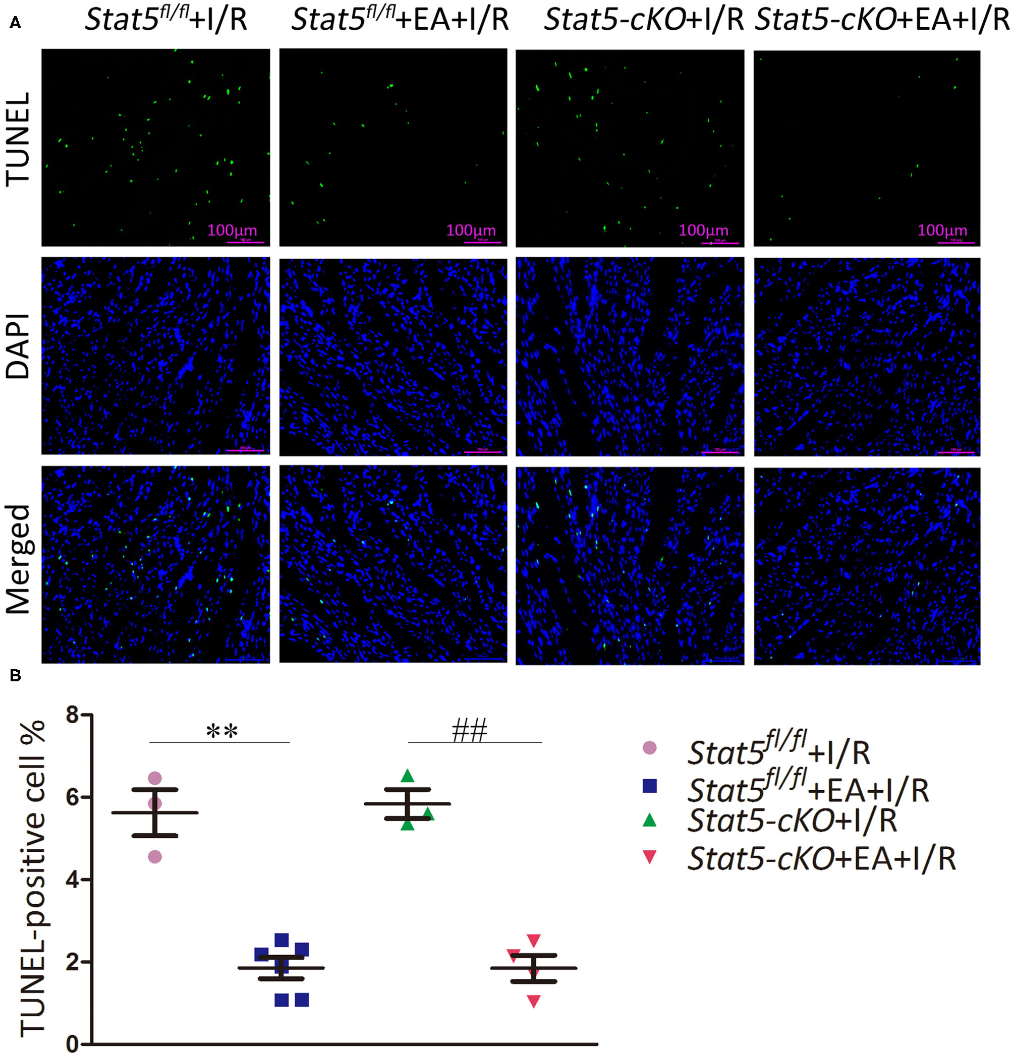 The effects of electroacupuncture pretreatment (EAP) on apoptosis in myocardial tissues in the Stat5fl/fl and the Stat5-cKO mice. (A,B) The rate of apoptosis was measured by TUNEL staining. Values are means ± SEM. **P < 0.01 compared with the Stat5fl/fl+I/R group; ##P < 0.01 compared with the Stat5-cKO+I/R group. Data were analyzed by two-way ANOVA with Bonferroni's multiple comparison test, n = 3–6.