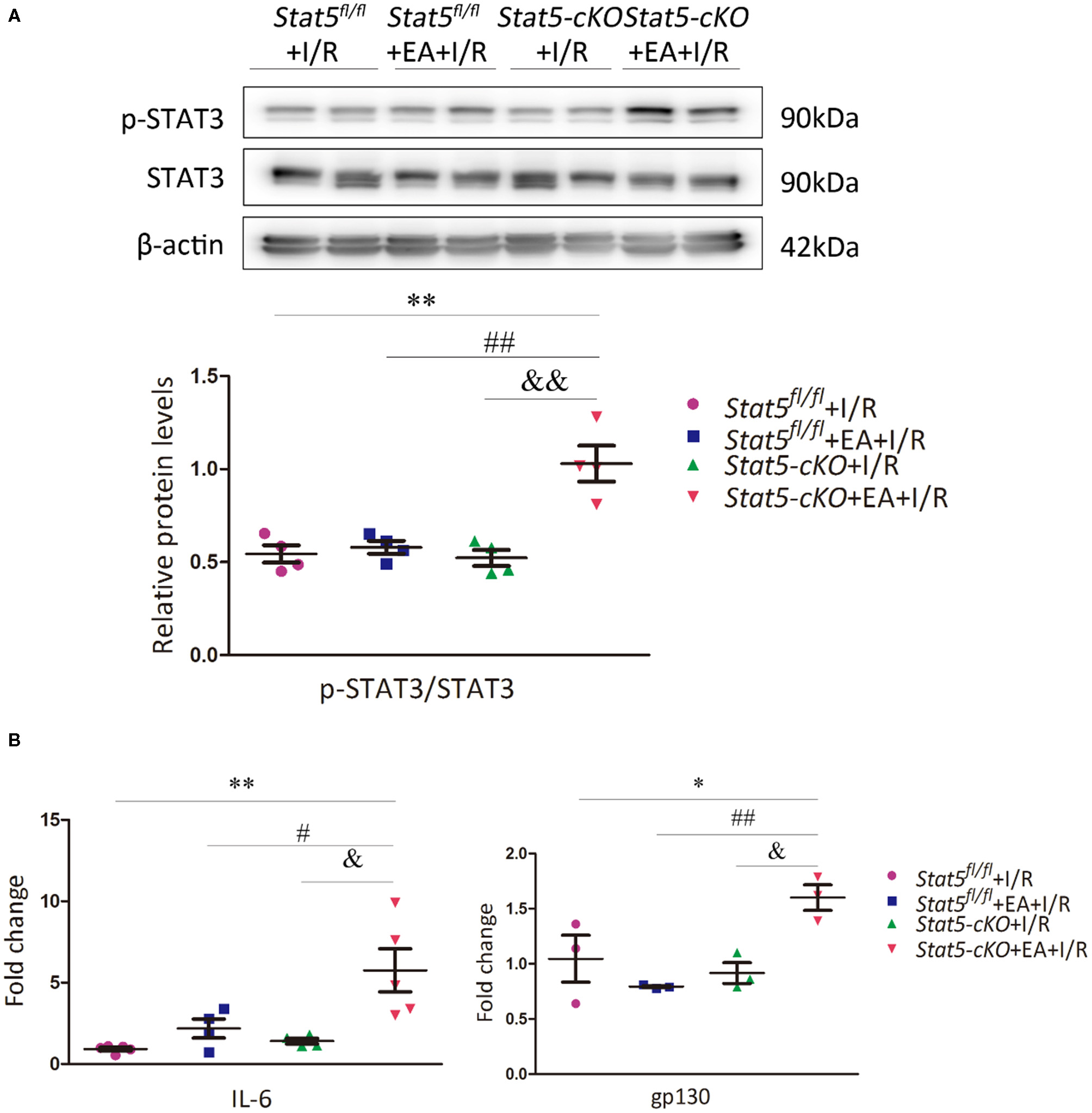 The expression of IL-6/gp130/STAT3 axis-related molecules. (A) The protein expression of STAT3 and p-STAT3 was assessed by western blotting. **P < 0.01 compared with the Stat5fl/fl+I/R group; ##P < 0.01 compared with the Stat5fl/fl+EA+I/R group; &&P < 0.01 compared with the Stat5-cKO+I/R, n = 4. (B) The expression of Il6 and gp130 mRNA was measured by RT-qPCR. Data are presented as means ± SEM of at least three independent experiments. *P < 0.05, **P < 0.01 compared with the Stat5fl/fl+I/R group; #P < 0.05, ##P < 0.01 compared with the Stat5fl/fl+EA+I/R group; &P < 0.05 compared with the Stat5-cKO+I/R group. Data were analyzed by two-way ANOVA with Bonferroni's multiple comparison test, n = 3–5.