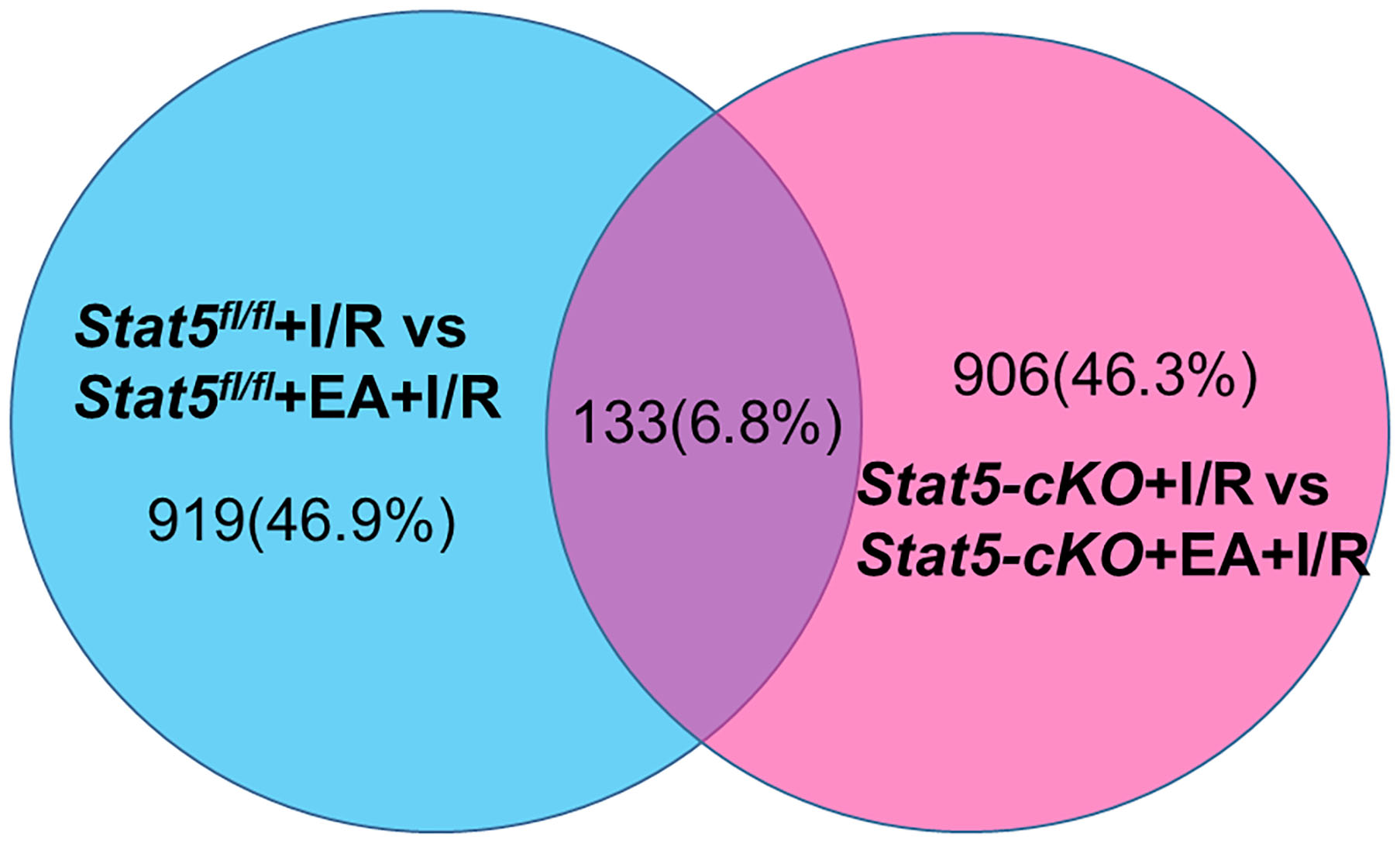 Venn diagrams and clustering analysis of RNA-seq results. Venn diagrams were drawn based on the RNA-seq datasets. The blue circle indicates the numbers of up- and downregulated genes in the Stat5fl/fl+EA+I/R group vs. the Stat5fl/fl+I/R group the pink circle represents the numbers of up- or downregulated genes in the Stat5-cKO+EA+I/R group vs. the Stat5-cKO+I/R group. A total of 133 genes overlapped between these two clusters.