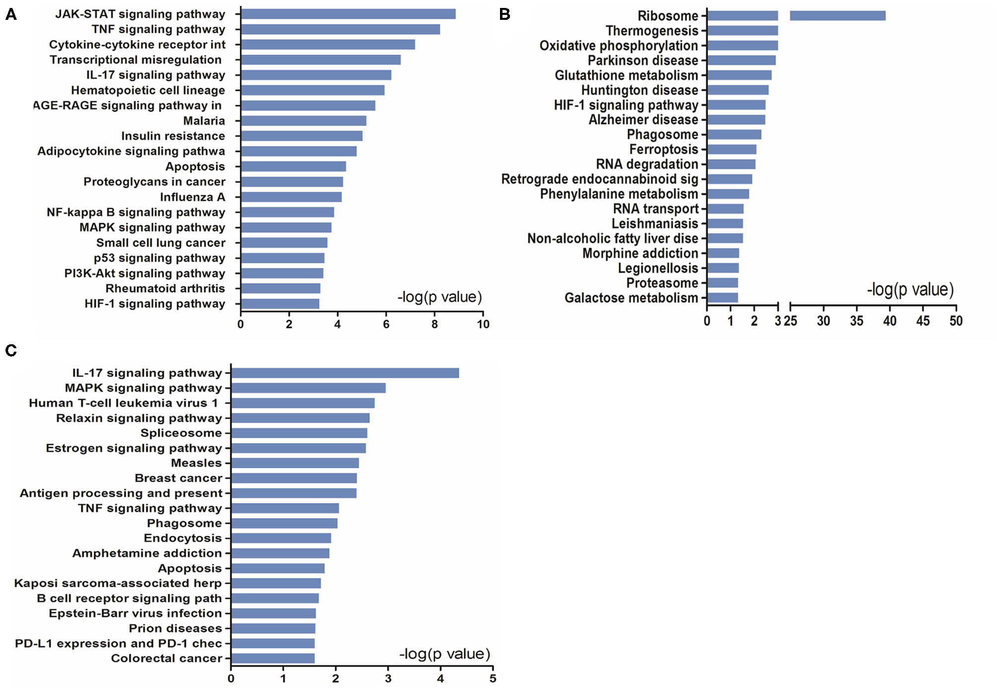 To further understand the potential pathways involved in the regulation of STAT5-related DEGs and that of EAP-related DEGs under conditions of I/R injury, we then carried out a pathway analysis for these DEGs using DAVID Bioinformatics Resources. The top 20 pathways are outlined in Figure 6.