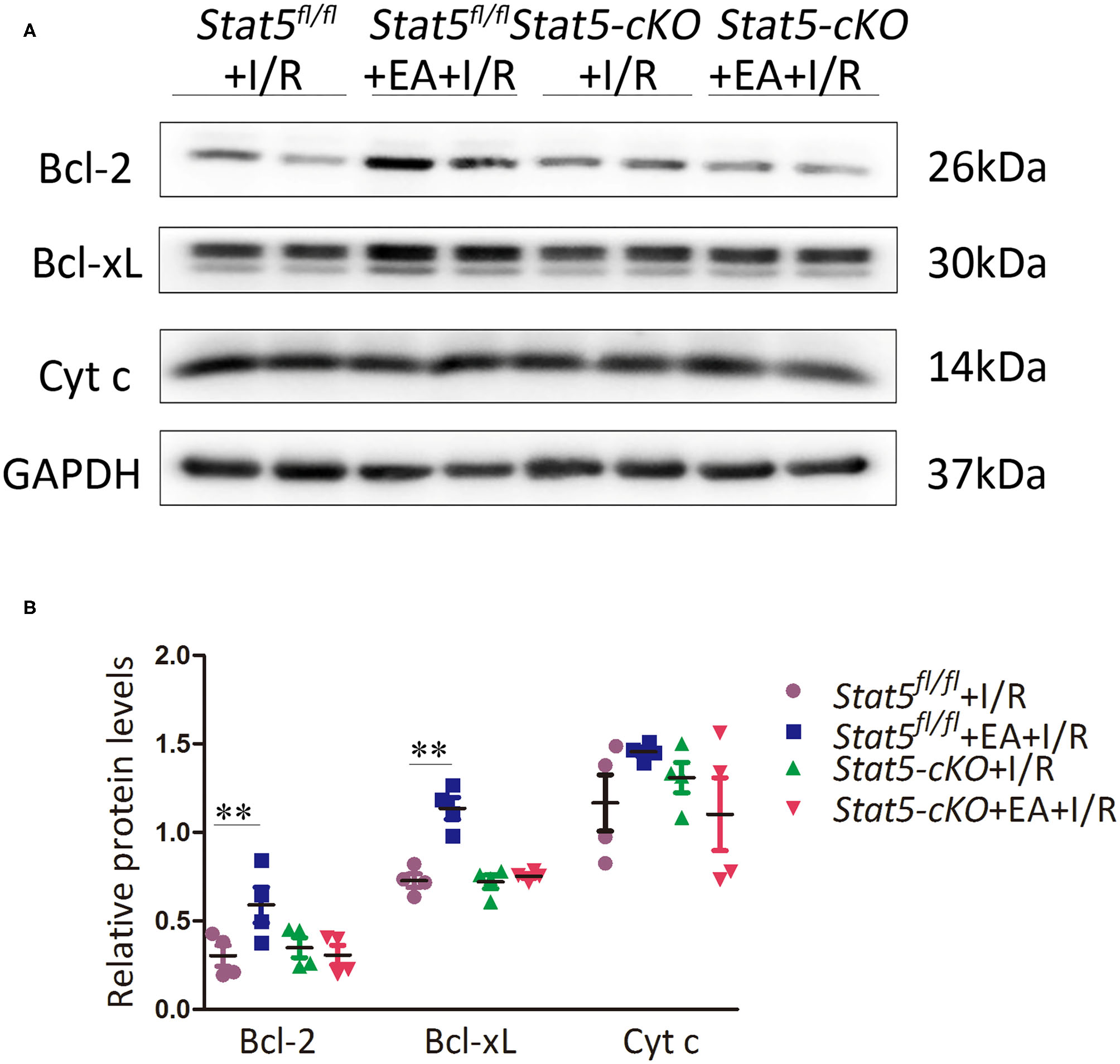 The expression of apoptosis-related proteins. (A,B) Western blotting was used to detect the levels of Bcl-2, Bcl-xL, and Cyt c in each group. Data are presented as means ± SEM of more than three independent experiments. **P < 0.01 compared with the Stat5fl/fl+I/R group. Data were analyzed by two-way ANOVA with Bonferroni's multiple comparison test, n = 4.