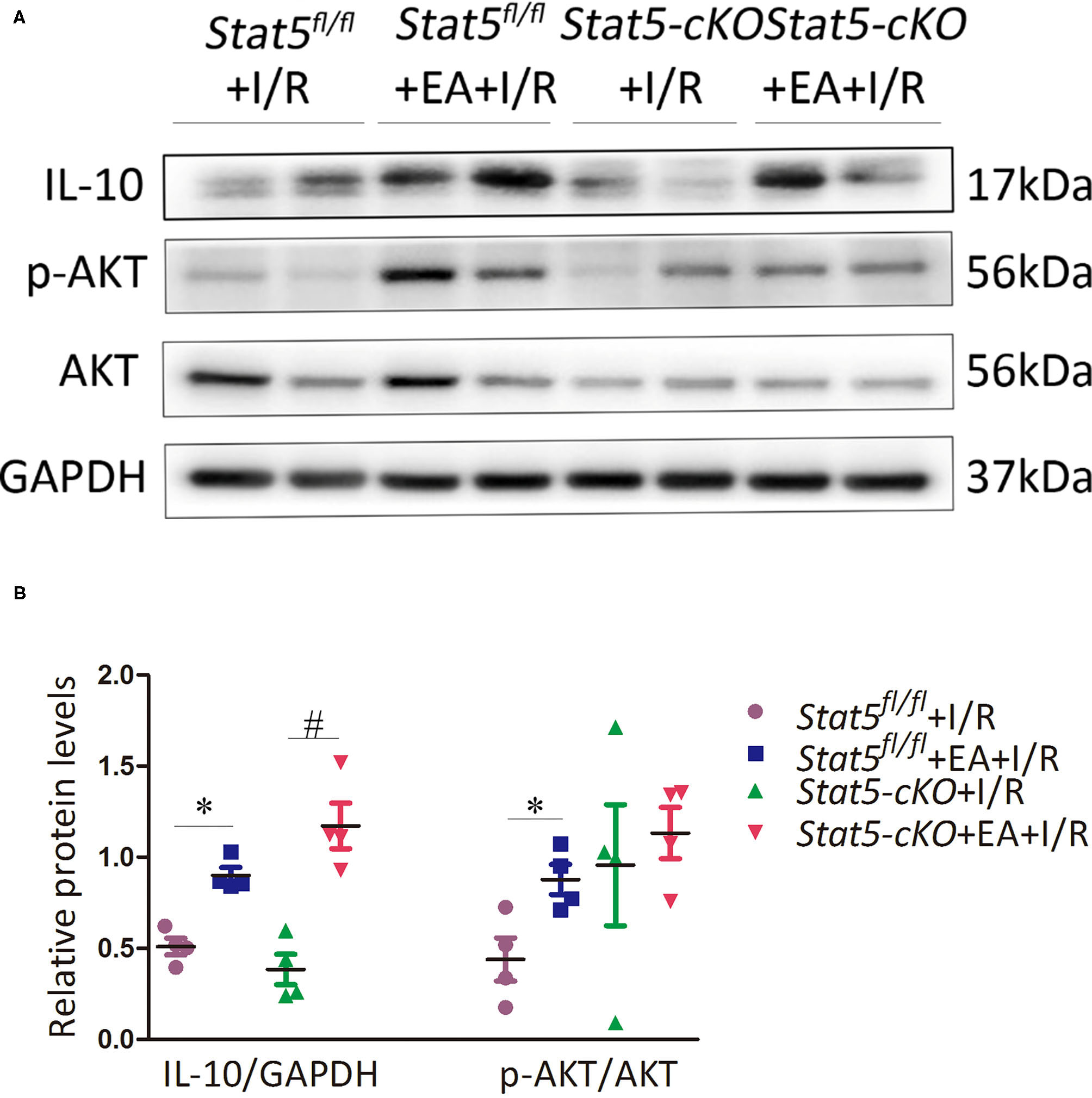 The expression of survival signaling-related proteins. (A,B) Western blotting was used to detect the levels of IL-10, p-AKT, and AKT in each group. Data are presented as means ± SEM of more than three independent experiments. *P < 0.05 compared with the Stat5fl/fl+I/R group; #P < 0.05 compared with the Stat5-cKO+I/R group. Data were analyzed by two-way ANOVA with Bonferroni's multiple comparison test, n = 4.