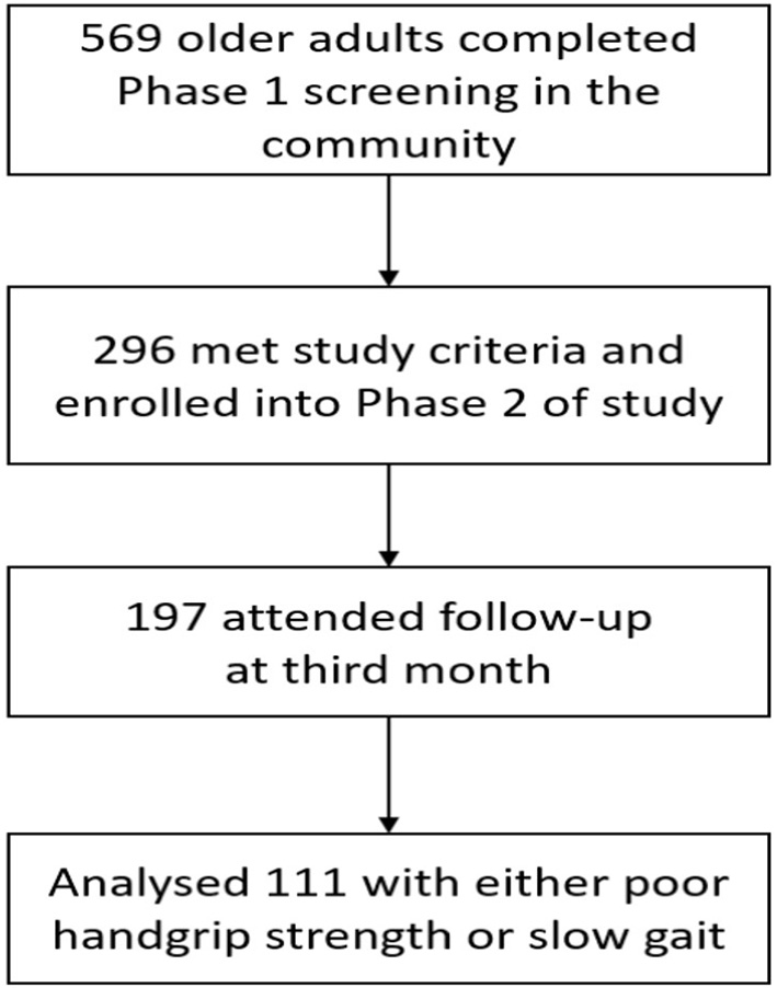 Exclusion criteria were diagnosis of dementia (Chinese Mini-Mental State Examination <18 or known diagnosis of dementia), wheelchair or bedbound, and living in a nursing home. A total of 569 seniors attended phase 1 screening, 296 participants were enrolled in phase 2 and complete follow up data was available for 197 participants at 3 months where 111 participants had either poor HGS or SG (Figure 1).
