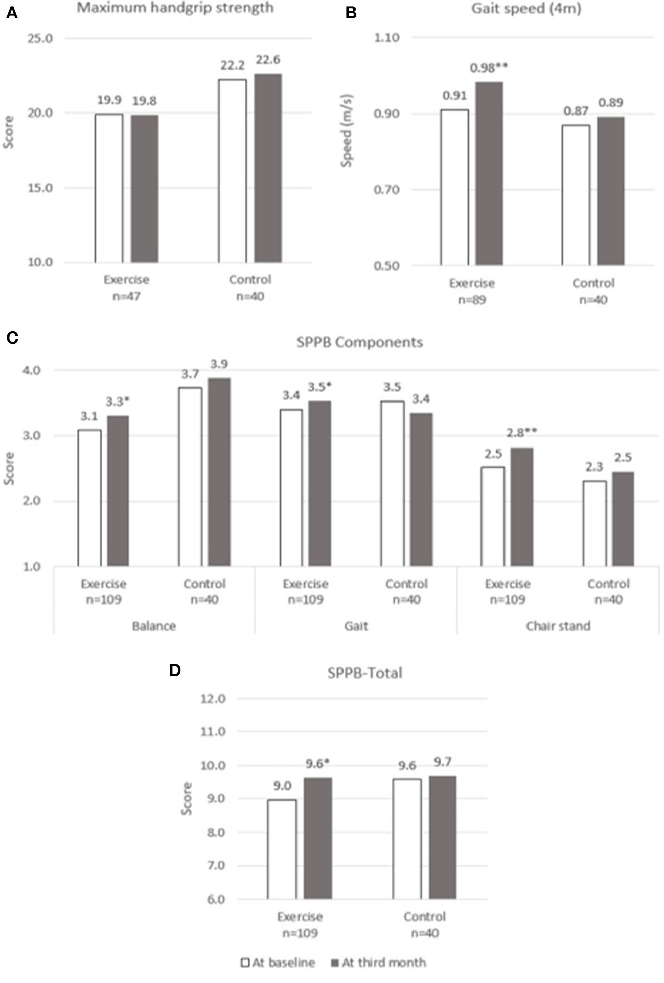 Physical performance at baseline and third month. (A) Maximum Handgrip Strength, (B) Gait speed, (C) SPPB Components, (D) SPPB-Total. SPPB, short physical performance battery. * and **indicate significant difference at p < 0.05 and p < 0.01, respectively between baseline and third month using paired sample t-test.