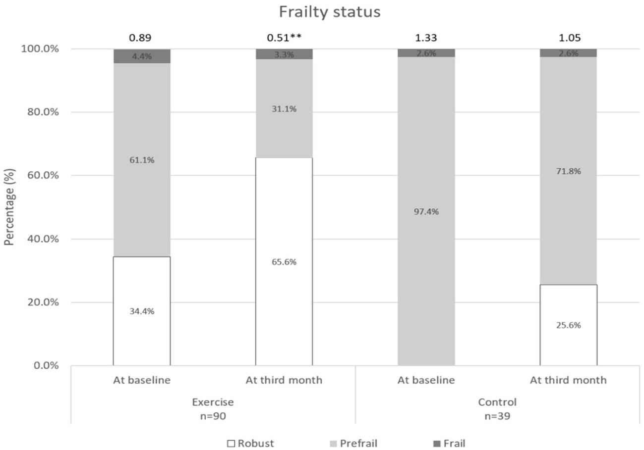 Frailty status at baseline and third month. **indicates significant difference at p < 0.01 between baseline and third month.