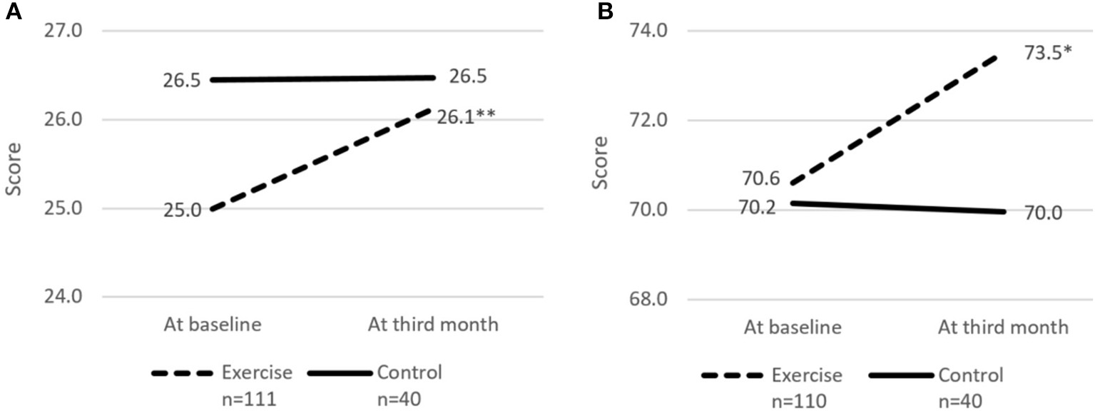 Descriptive statistics were presented as mean values (standard deviation) for continuous variables and frequencies (percentages) for categorical variables. Differences in baseline characteristics between the Exercise and Control group were analyzed using Independent T-test on continuous variables and Chi-square on categorical variables. Change in outcome variables were calculated as difference between baseline and 3rd month time-point with positive values indicating improvement and negative values indicates decline. Paired sample t-test and McNemar were performed to determine statistical difference between baseline and 3rd month for continuous and categorical variables, respectively. To find out if changes were significantly different between the Exercise and Control group, linear regression was performed with change in individual outcomes variables as dependent variable and grouping (Exercise/Control), age, education level, and number of exercise sessions attended as independent variables in Model 1 and further, adjusted for corresponding baseline values, level of physical activity and presence of multi-morbidities in Model 2. Significance level was set at p < 0.05 and all analyses were analyzed using SPSS Version 26.0.