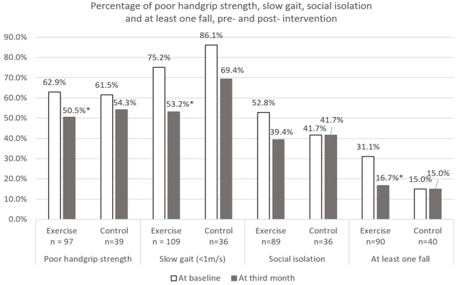 Percentage of poor physical performance, social isolation, and at least one fall at baseline and third month. *Indicates significant difference at p < 0.05 between baseline and third month using McNemar test. Poor handgrip strength defined using Asian Working Group for Sarcopenia (2019) (Cut-off: Male < 28 kg and Female < 18 kg). Social isolation defined using 6-item Lubben social network scale (Cut-off: < Score of 12).