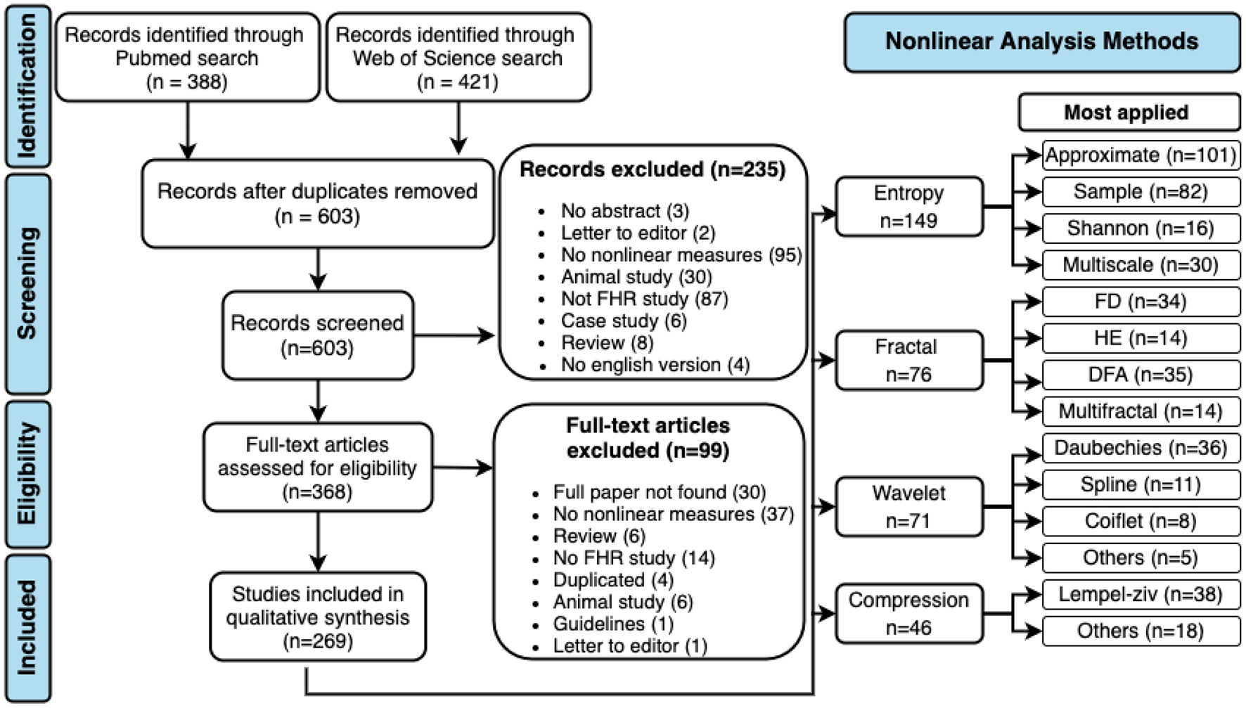 A total of 603 abstracts were assessed, 368 of which retained for full-text screening. Two hundred and seventy papers were then included in the review after meeting all the criteria. Figure 1 contains the PRISMA flow diagram for study selection, including reasons for exclusion. The most used non-linear analysis measures to study the dynamics of fHR obtained in the systematic review are also represented in Figure 1.