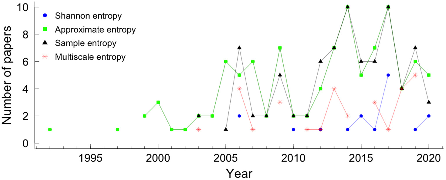 In the literature, we found other entropy measures that appeared in less than 15 articles, such as, permutation entropy (41–45), Rnyi entropy (46–48), Kullback-Leibler entropy (41, 42, 49, 50), Kolmogorov-Sinai entropy (30), cross-sample entropy (51, 52), tone-entropy (53), bubble entropy (47), and compression entropy (46).