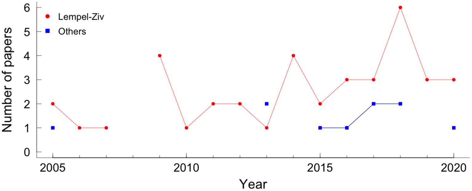 Papers using compression in fetal heart rate, by year. The red circle represents the Lempel-Ziv compressor and the blue square represents the other compressors.